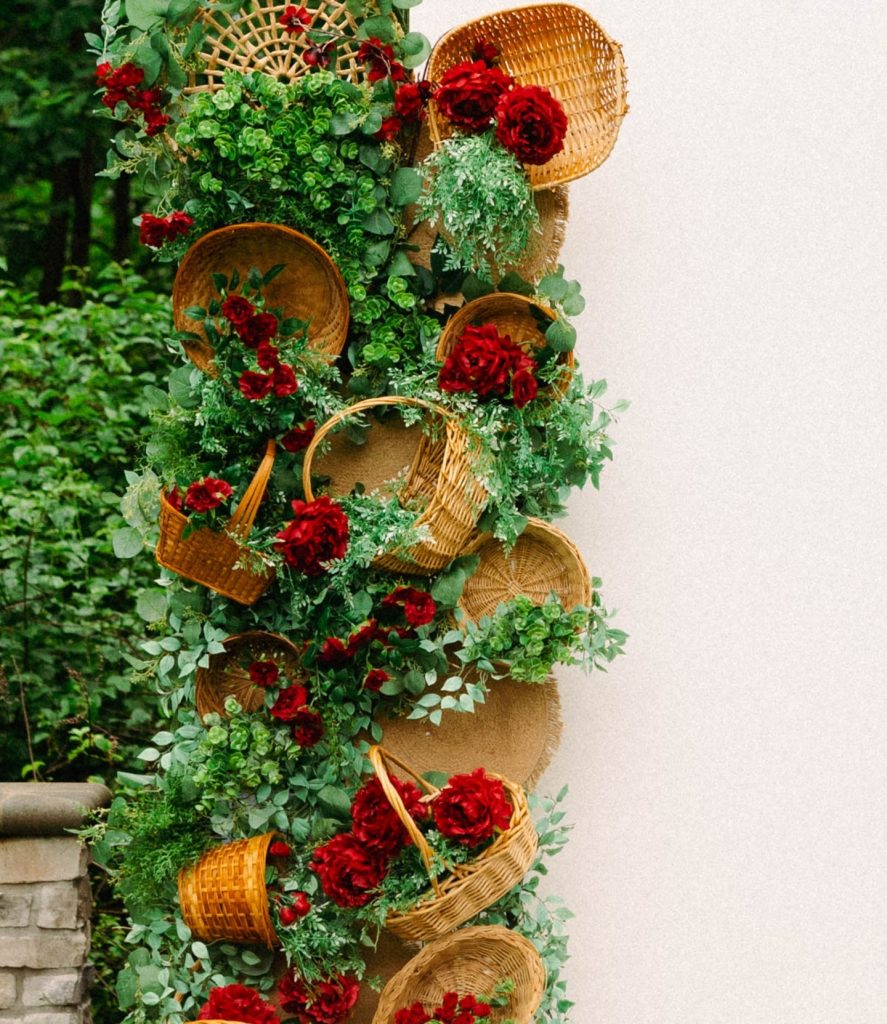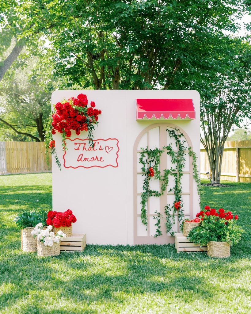 Create stunning Italian-inspired photo moments with a dramatic red balloon arch featuring cascading greenery and red roses, perfect for capturing that romantic “That’s Amore” feeling! Set up a charmingly simple Italian cafe backdrop using a white wall decorated with red script lettering, Italian phrases, and illustrated elements like pizza slices and wine bottles. For an authentic touch, hang wicker baskets filled with vibrant red geraniums and trailing ivy along walls or fences. You can create a rustic Italian villa feel with climbing greenery, wooden shutters, and vintage Italian signage for that perfect Tuscan countryside vibe.