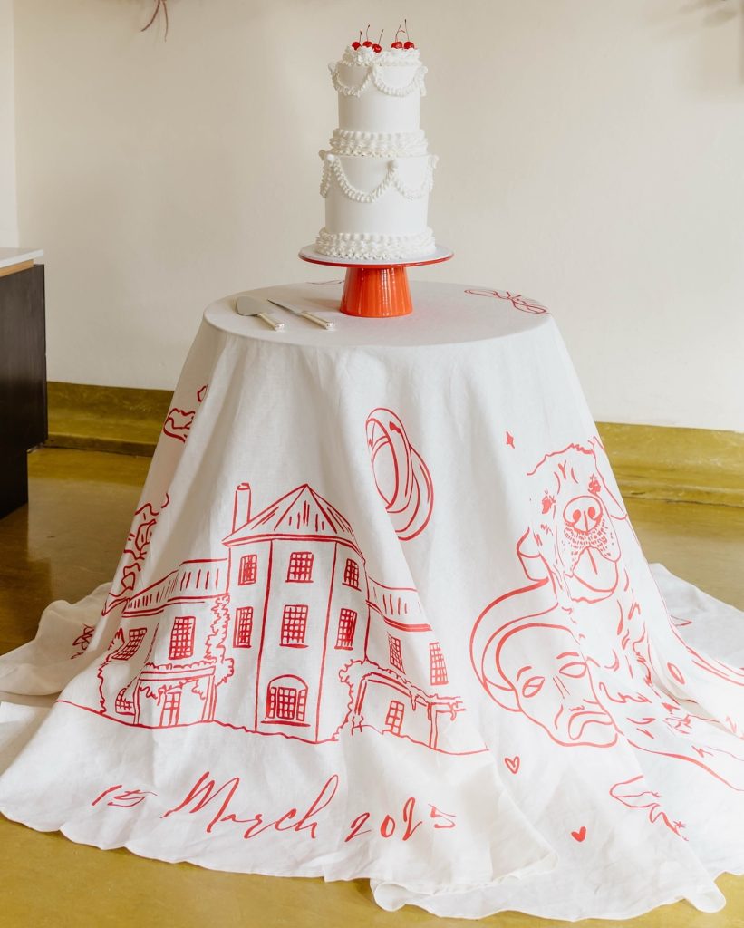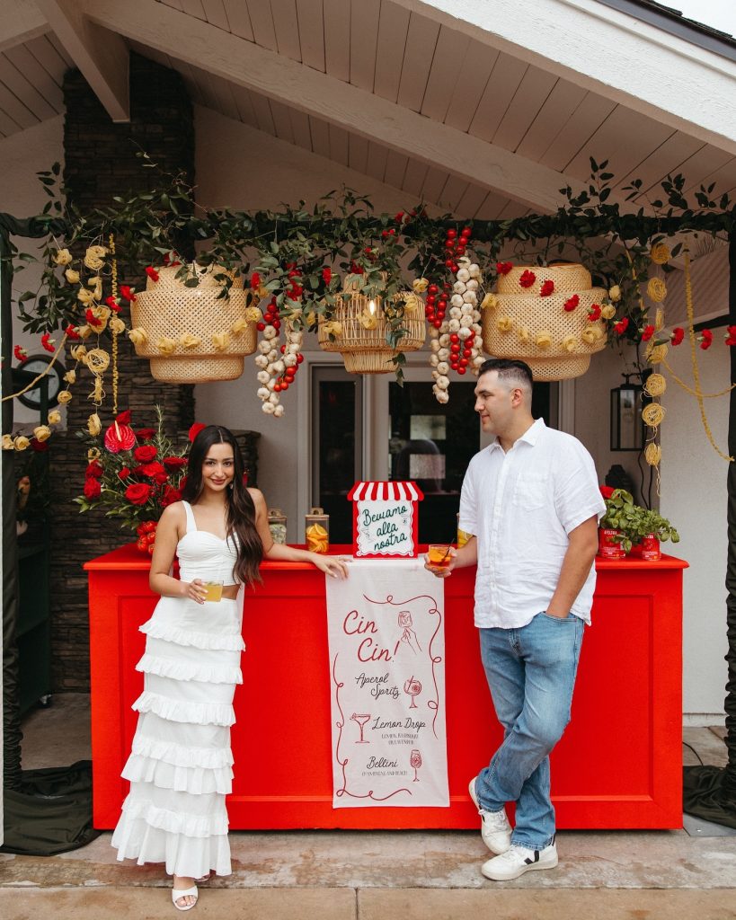 Take your tablescapes next level with personalized hand-drawn tablecloths featuring whimsical Italian dinner illustrations, complemented by custom cocktail napkins with the bride’s name and celebration date. Add charming pizza heart-shaped place cards for a playful touch, and include “That’s Amore” phrase centerpieces in floral arrangements. Complete the look with personalized champagne labels featuring classic Italian icons and custom stadium cups for toasting.
