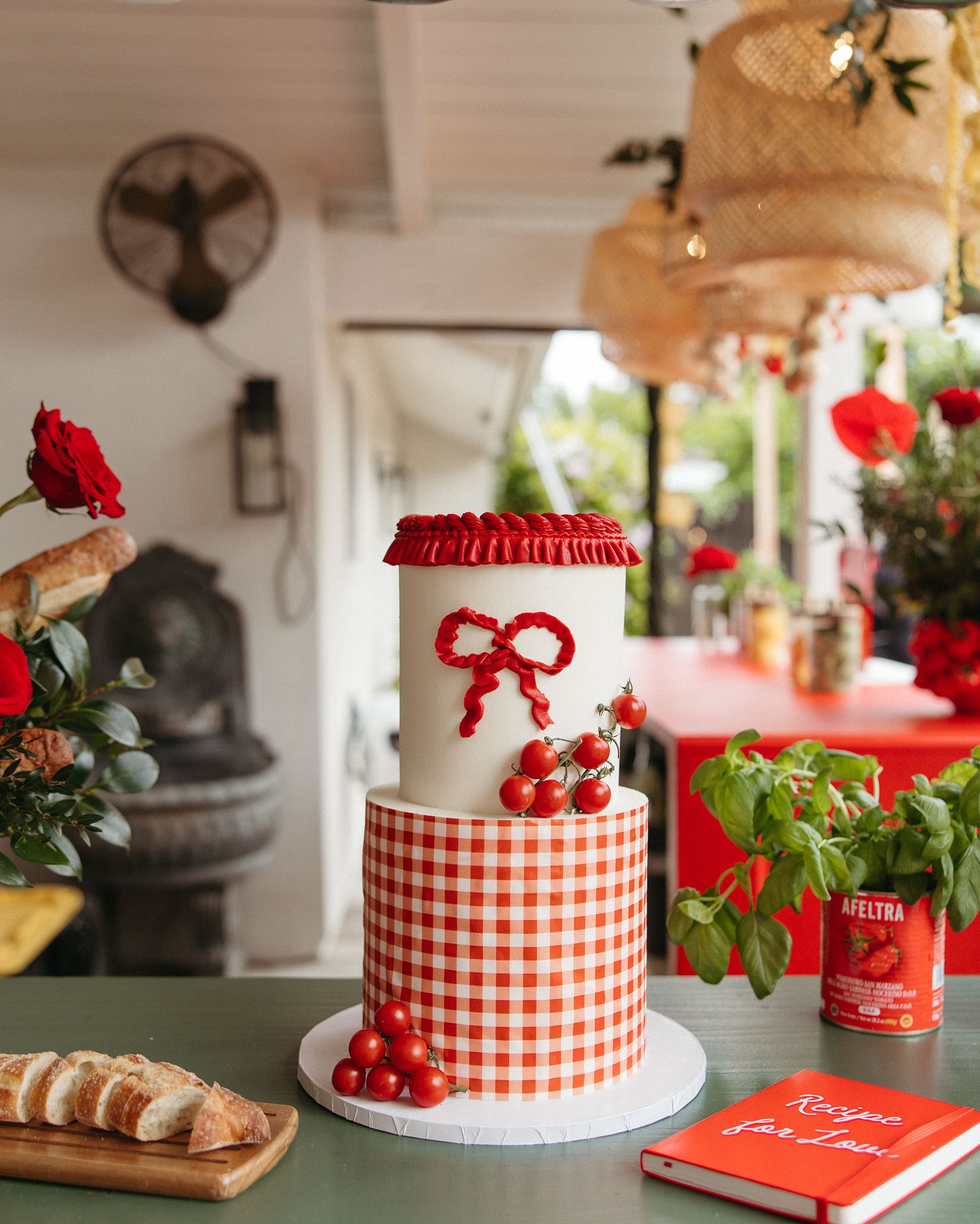 - Design a show-stopping red and white gingham cake adorned with a fondant bow and fresh strawberries that oozes Italian charm.