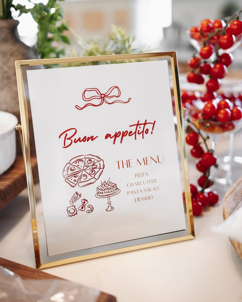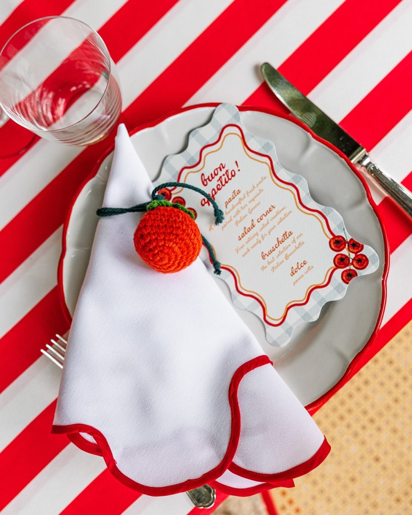 Complete your favor presentation with personalized muslin cotton favor bags or whimsical hand-drawn favor tags with Italian food illustrations. Add authentic Italian flair with “Grazie” thank you stickers or personalized, pizza slice-shaped gift tags.