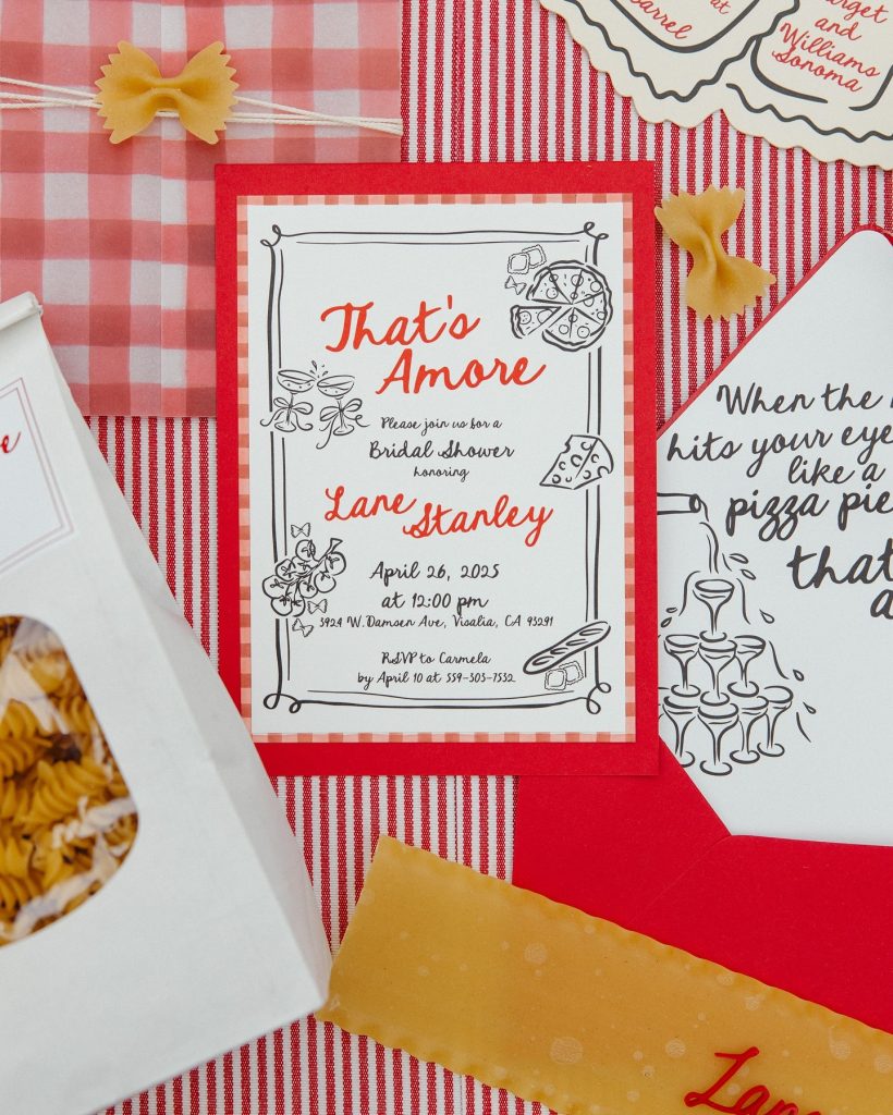 These charming “That’s Amore” bridal shower invitations feature a classic cream and red color palette with elegant typography.