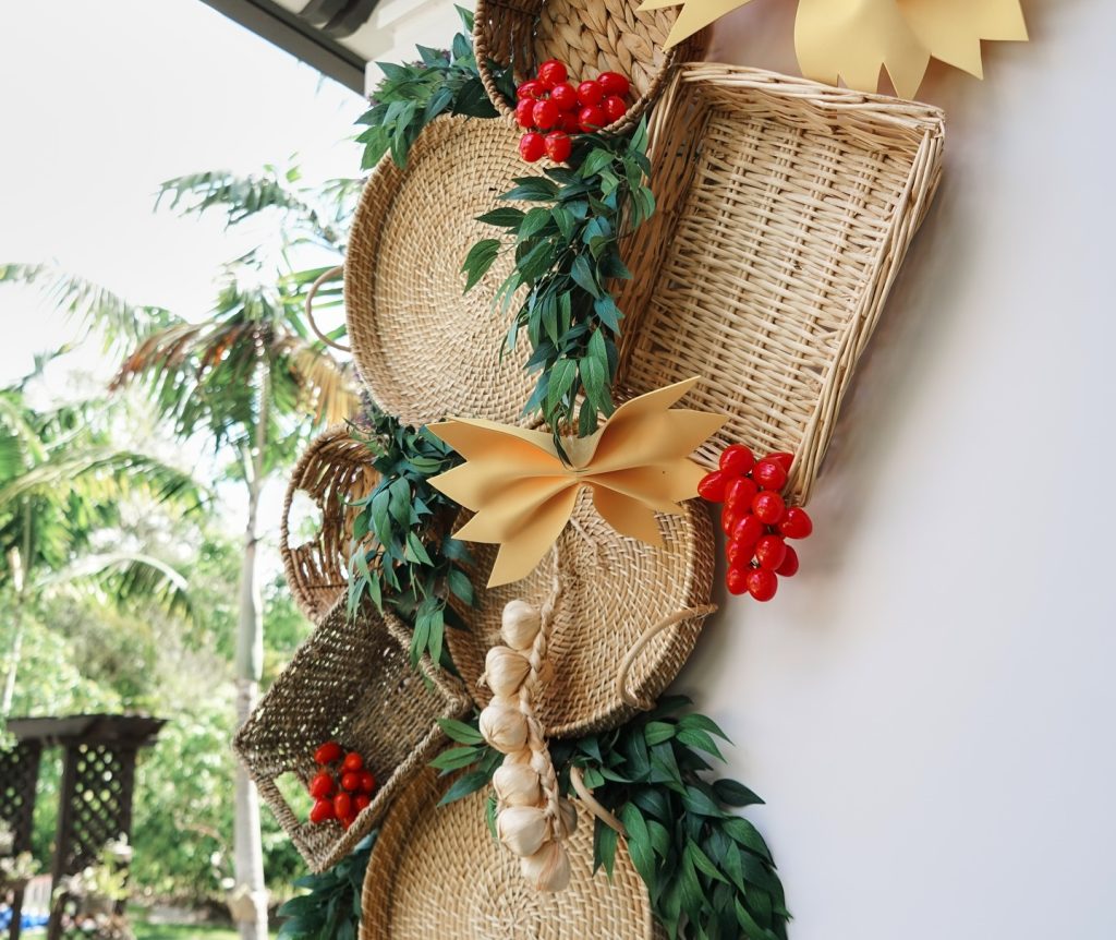Display fresh produce like tomatoes, herbs, and garlic in wicker baskets with small chalkboard signs. Don’t forget a pizza station with individual bases and gourmet toppings for guests to customize.