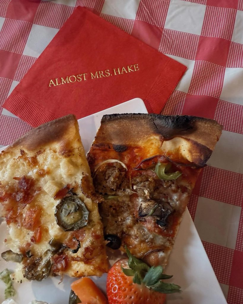 For a cute touch, provide custom printed pizza boxes featuring the bride’s name and date for a memorable takeaway!