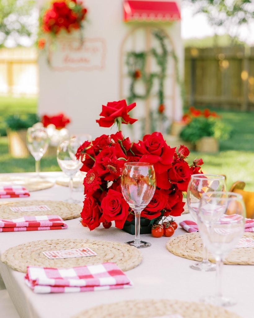 Layer classic red and white gingham tablecloths with crisp white napkins tied with red ribbons for that quintessential Italian trattoria look. Use woven charger plates or rustic wooden chargers topped with white dinner plates and red glassware. Place small terracotta pots filled with fresh herbs like basil and rosemary and scatter cherry tomatoes on the vine for an authentic, rustic feel. Complete each place setting with menu cards featuring Italian phrases like “Buon Appetito!” in red script. Take your event into the evening by creating intimate lighting with pillar candles in glass hurricanes.