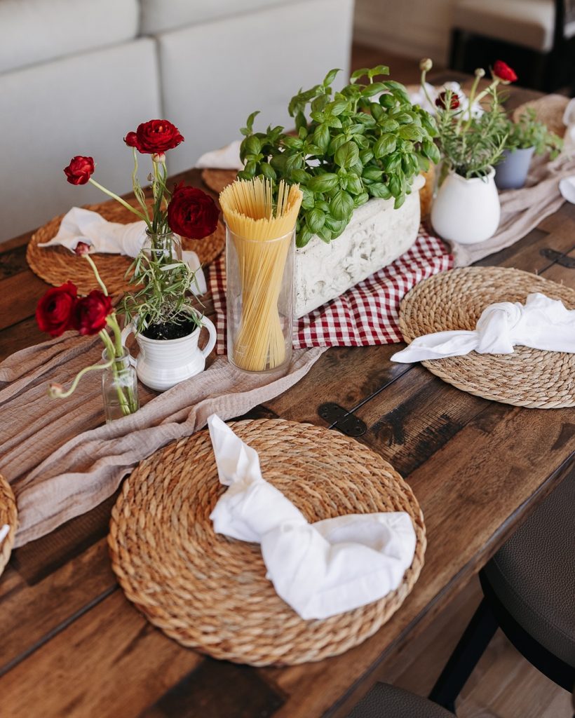 Classic red and white checkered tablecloths reminiscent of a cozy Italian trattoria, rustic wicker baskets filled with fresh herbs and cherry tomatoes, and the inviting aroma of homemade pizza and pasta filling the air.