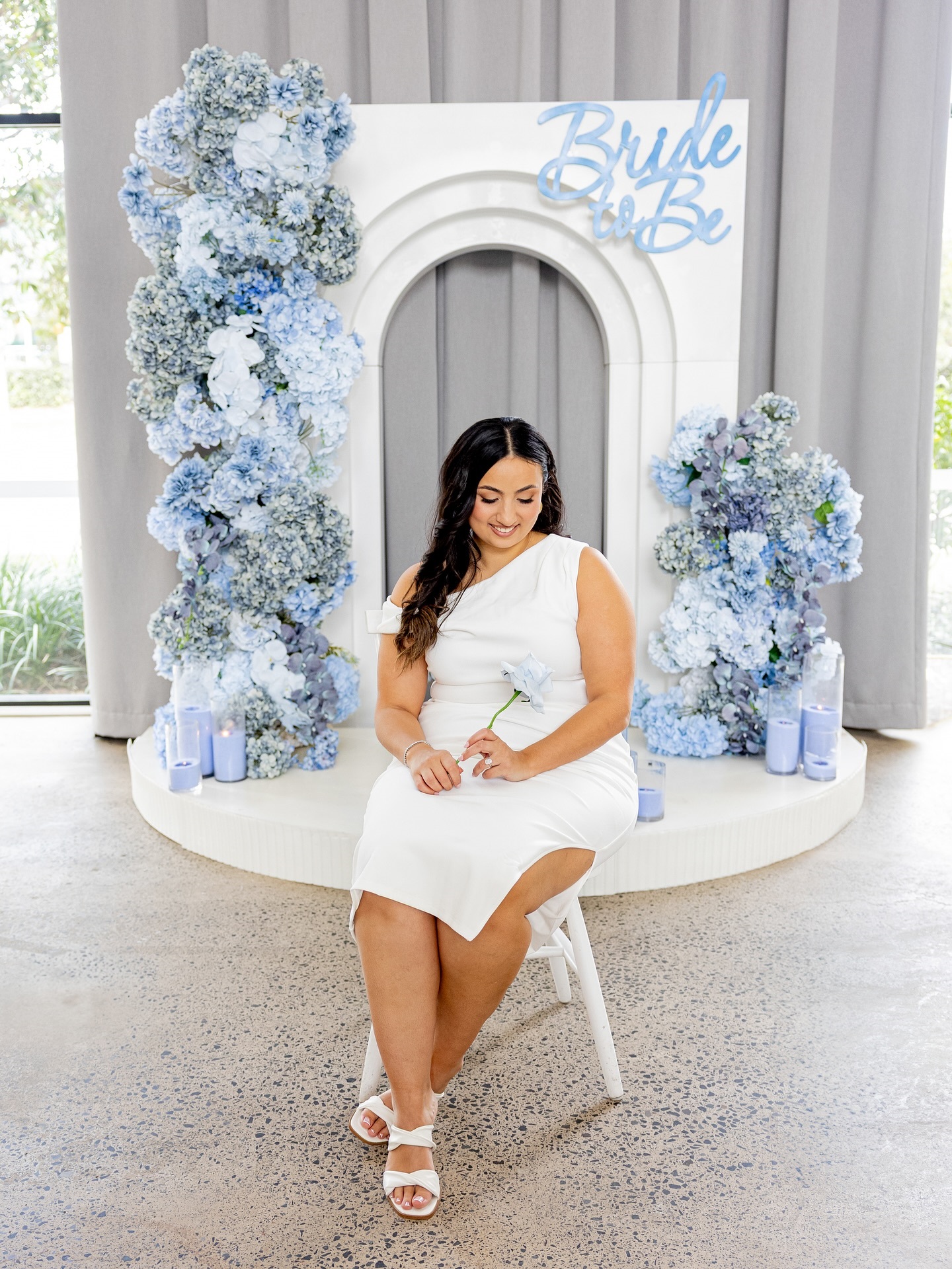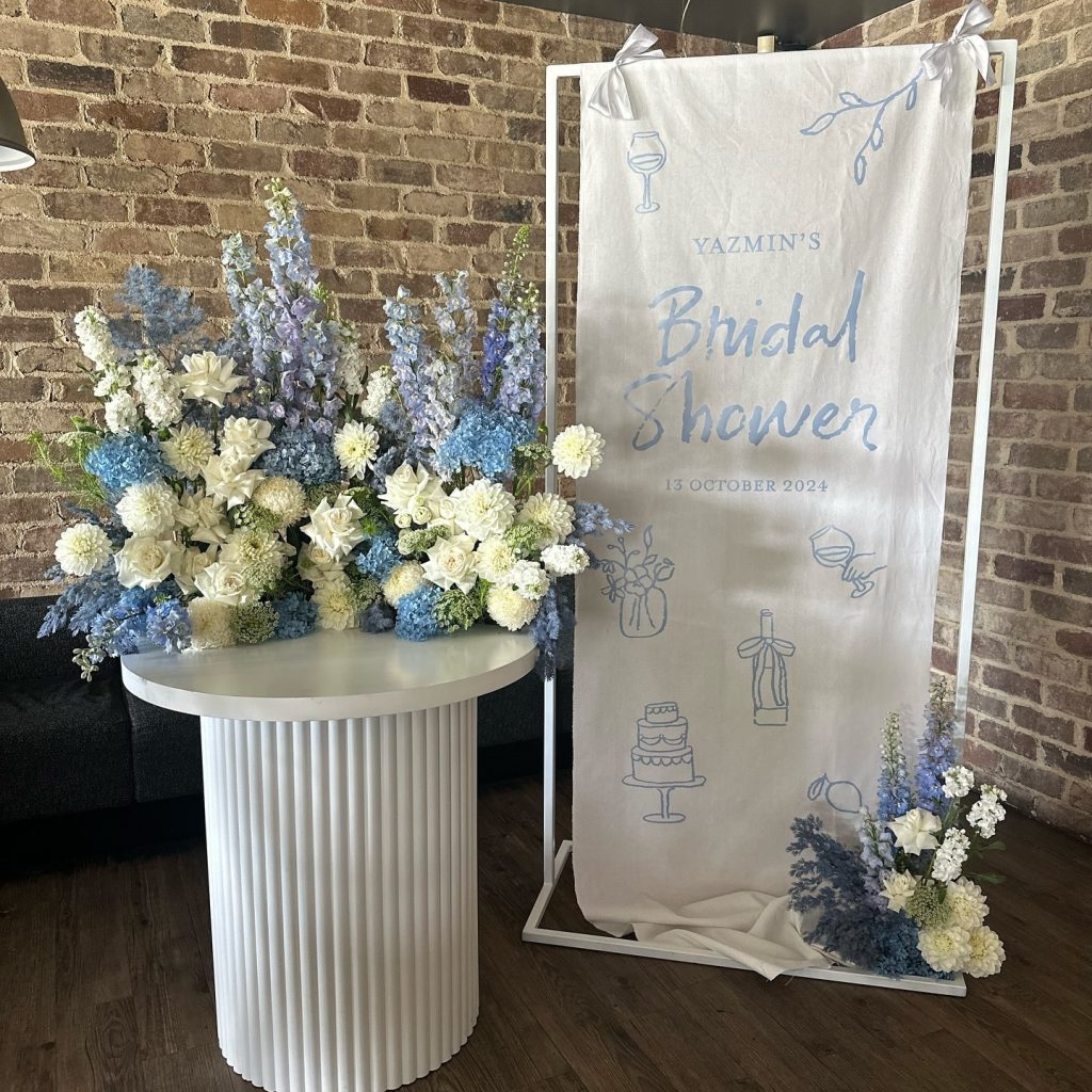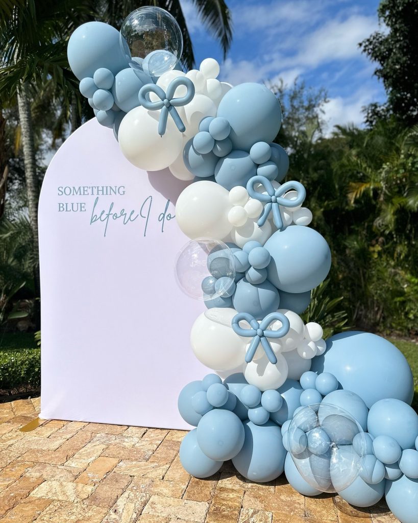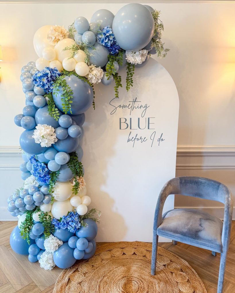 - An elegant balloon installation in varying shades of blue paired with crisp white accents, with centred signage featuring, “Miss to Mrs”, “Bride to Be” or “Something Blue Before I Do”.