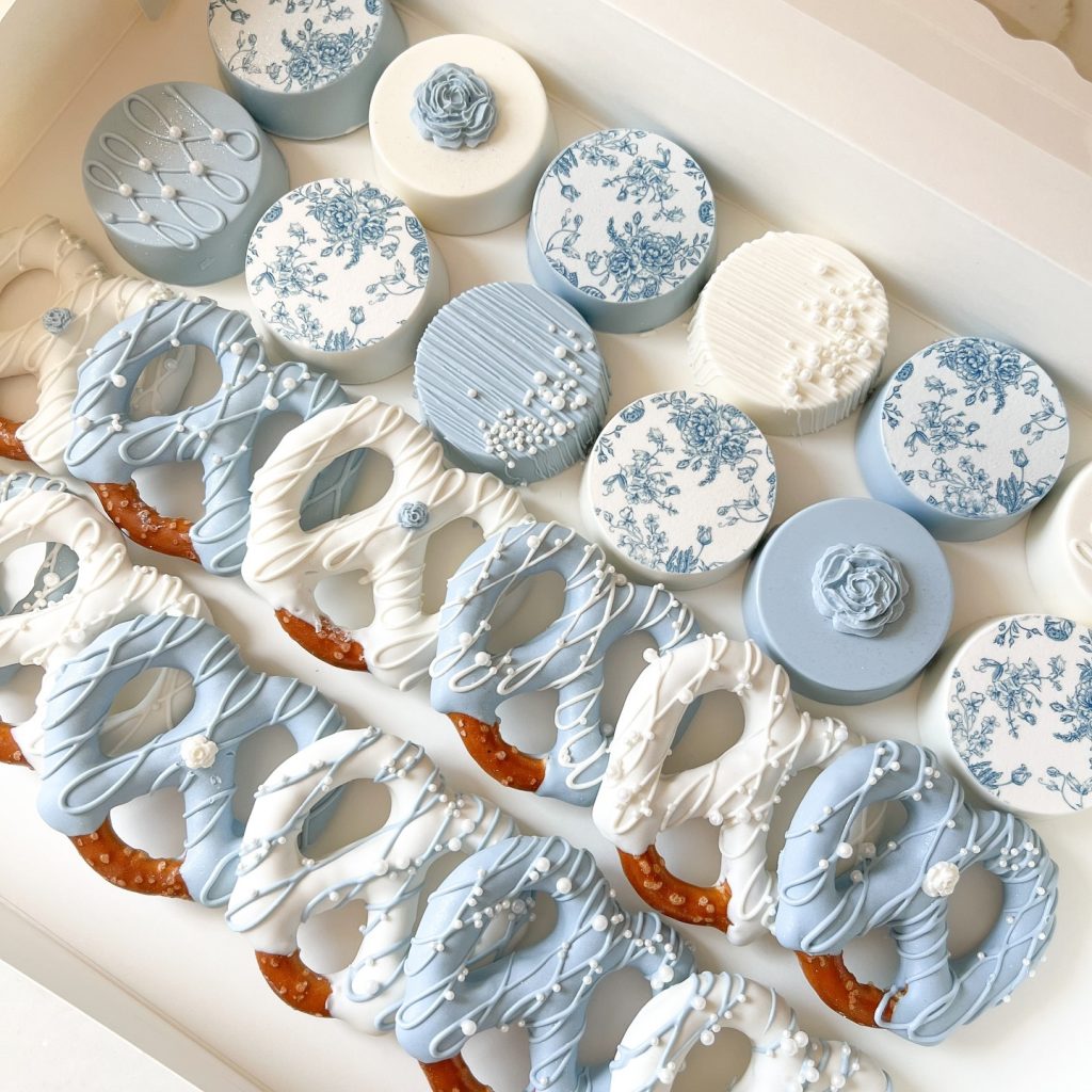 Showcase sweet confections inspired by “Something Blue” on a stunning tiered display. Choose a fresh white cake adorned with delicate blue sugar flowers or textured buttercream frosting as your centrepiece. Complement with custom decorated cookies featuring intricate blue and white royal icing designs. Round out the display with cake pops, dipped pretzels, and other petit fours decorated in the signature palette for a beautiful dessert presentation.