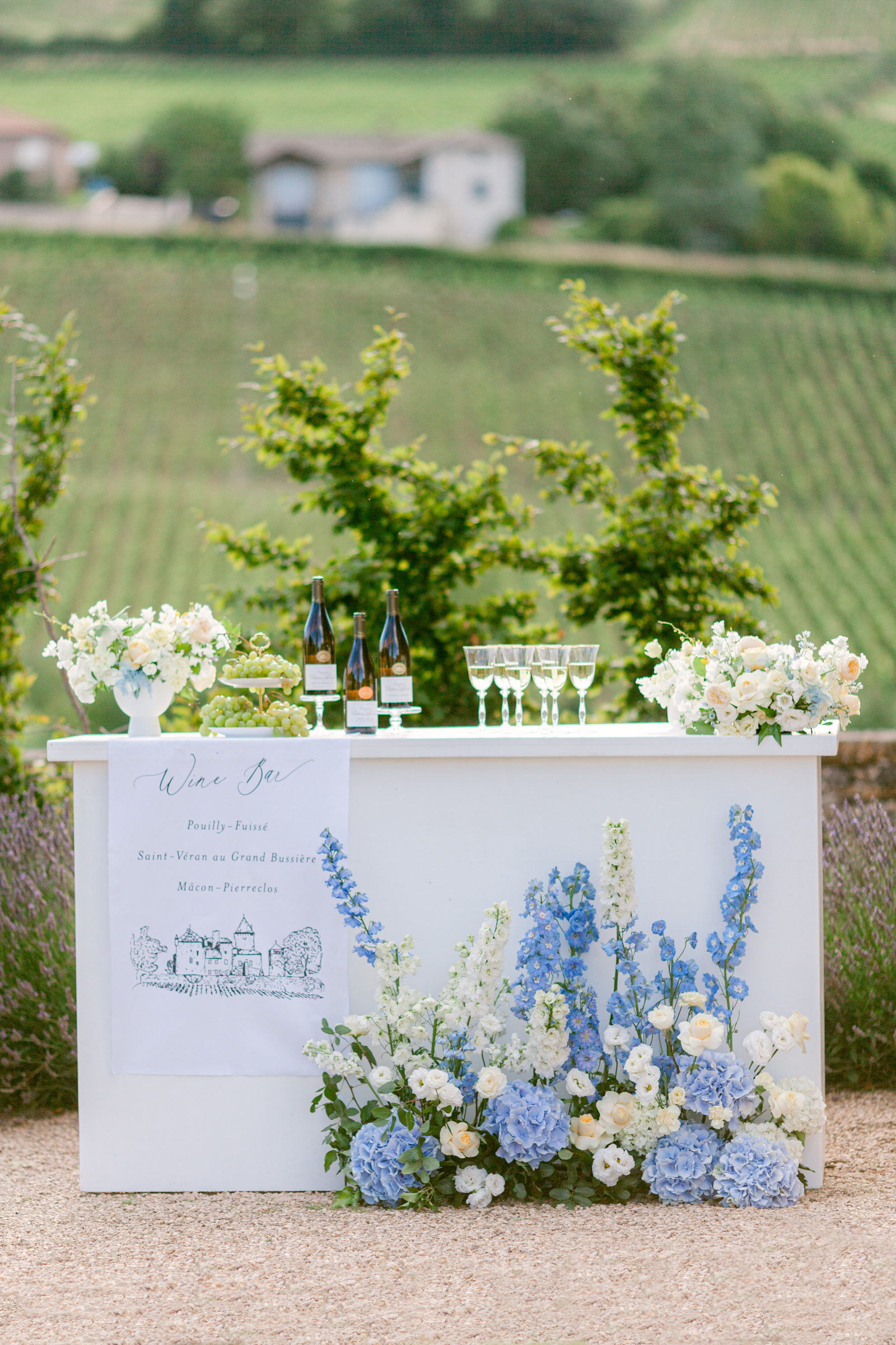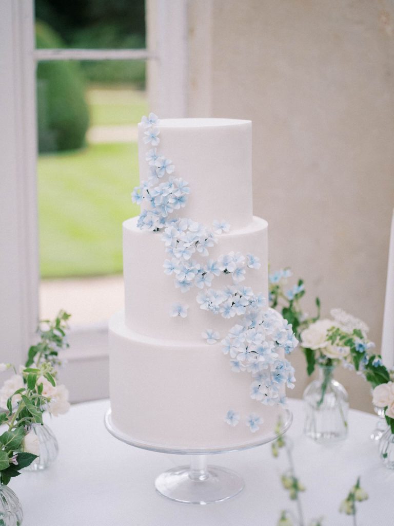 Dial your floral styling up a notch by adding lush arrangements featuring blue hydrangeas, white roses and greenery in crystal or white ceramic vases.