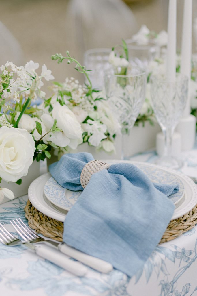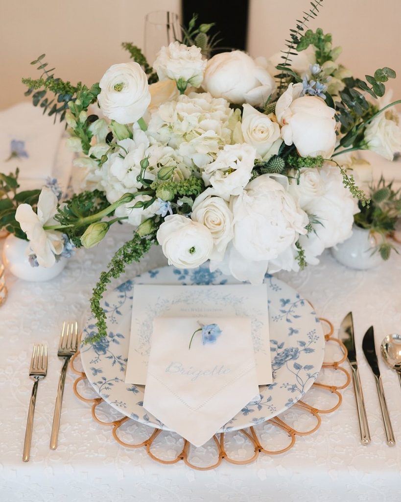 Layer blue and white chinoiserie plates with crisp white linens and crystal stemware. Add a blue table runner, patterned chargers, and coordinating blue napkins with chiffon ribbon ties. Small floral arrangements in mixed blue and white vessels serve as elegant centerpieces for a fresh aesthetic.