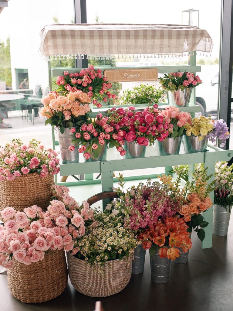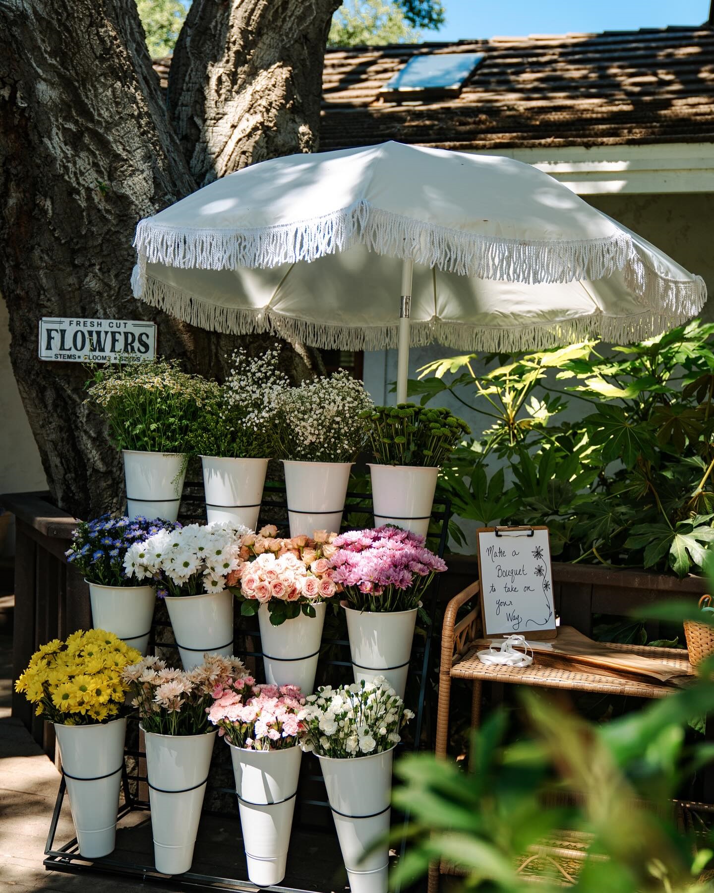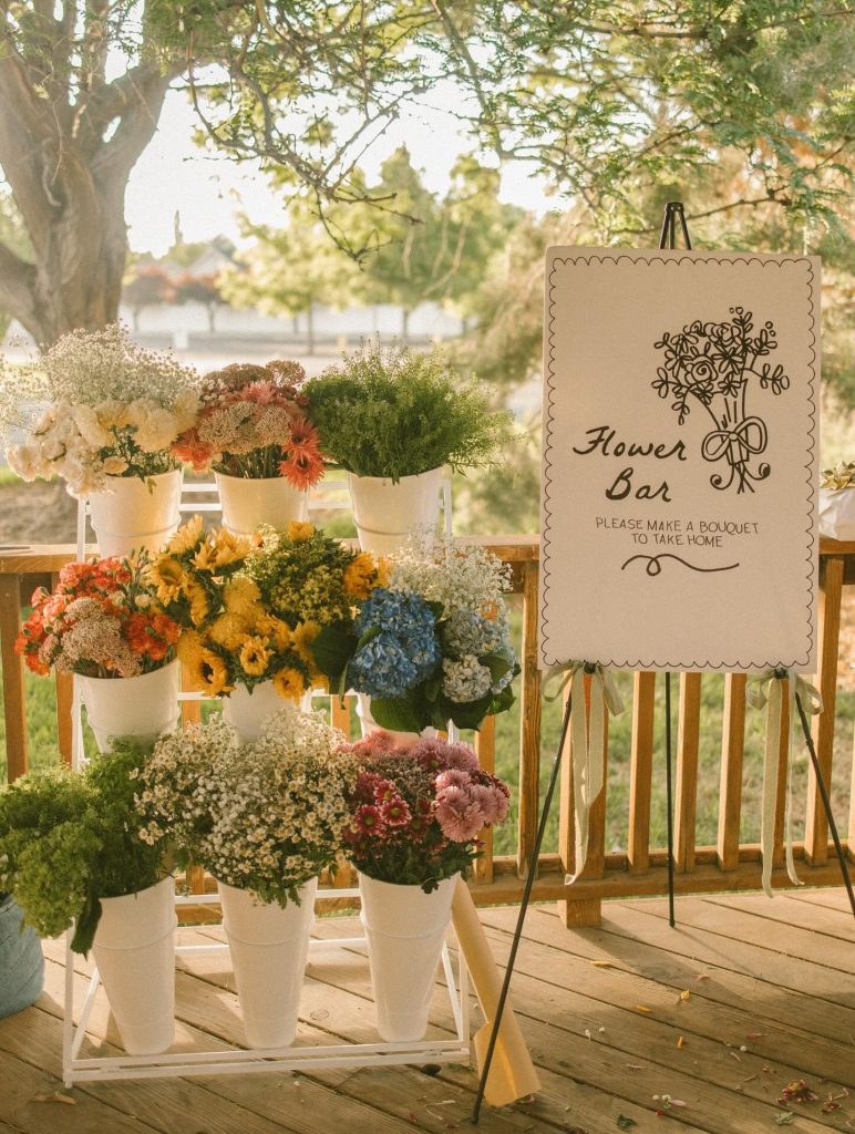 Create a flower market station with buckets of fresh blooms and greenery, kraft paper and twine for that authentic market wrap, and everyone can take their creation home.