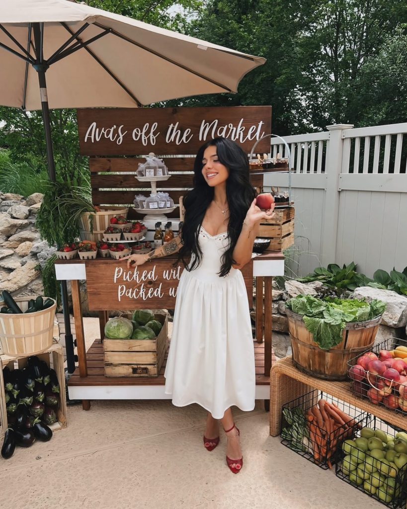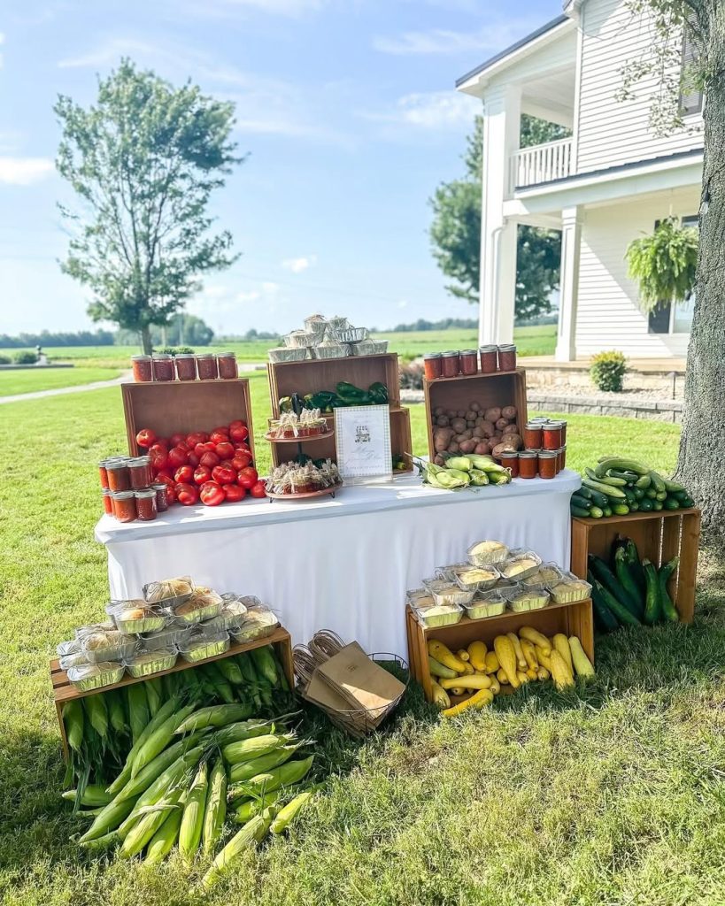 Think wooden crates and wicker baskets overflowing with seasonal produce beneath striped awnings, herbs and vegetables serving as natural table decor atop gingham linens, and a “She’s Fresh off the Market” sign as a welcome and photo backdrop.