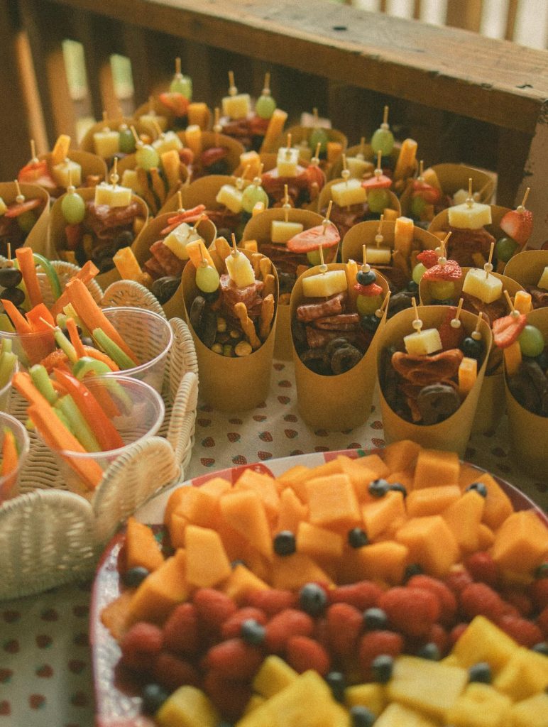 Build an abundant grazing table using rustic containers for tiered displays of fresh fruits, vegetables, artisanal cheeses and charcuterie for an authentic and fun market stall aesthetic.