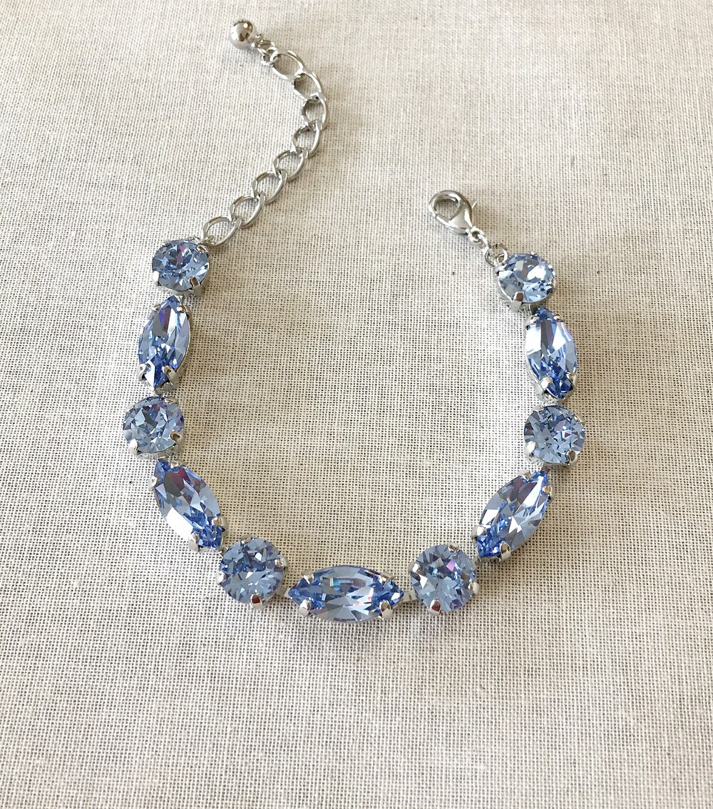 This elegant bracelet features sparkling light sapphire blue crystals in a stunning alternating pattern of 8mm round and 15x7mm marquise shapes. Adjustable between 6½ and 8 inches in length, the versatile design complements any formal attire or bridal ensemble. Your “something blue” to complete your wedding day look!