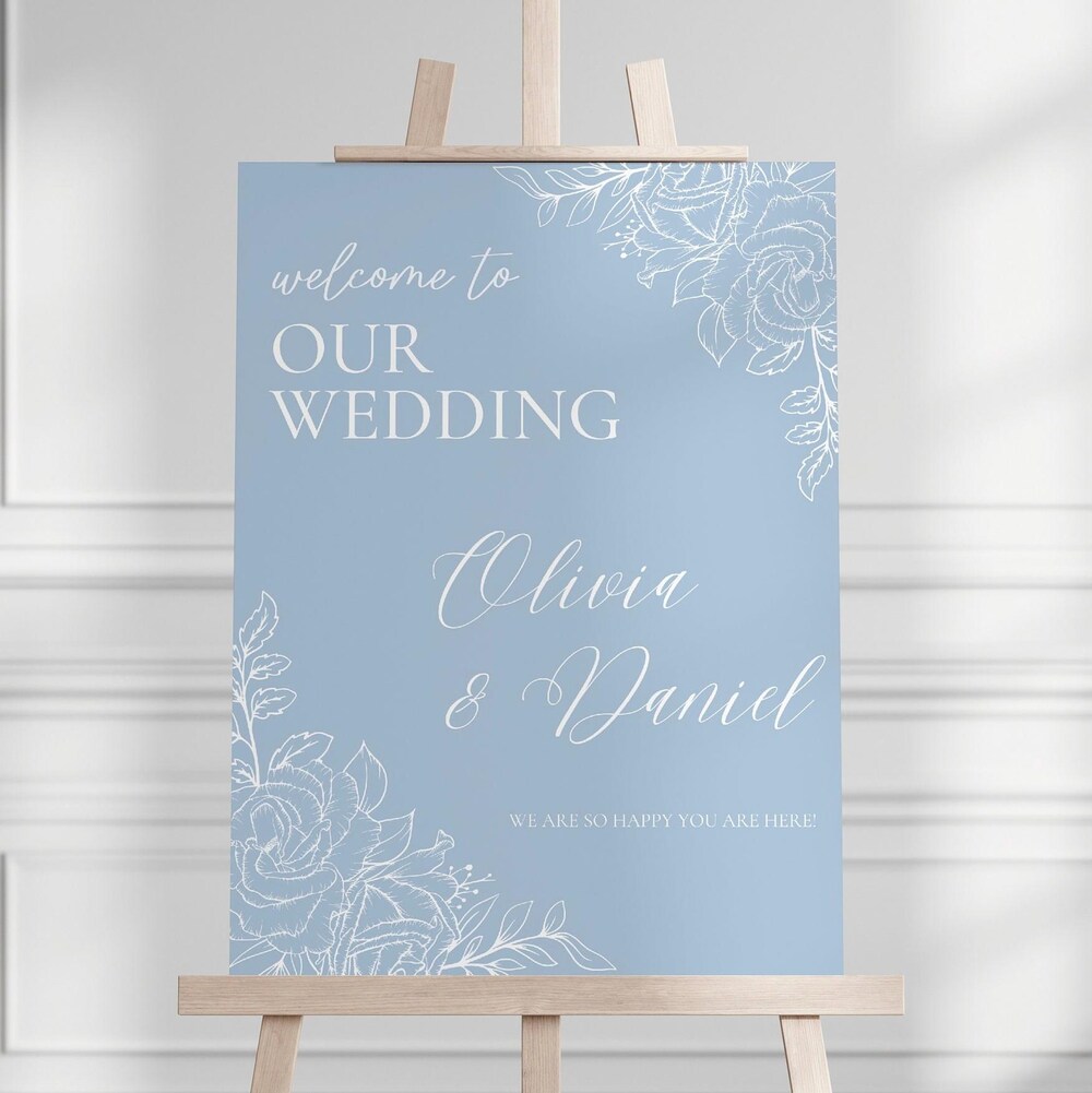 Welcome your guests in style with this elegant dusty blue wedding welcome sign that sets the perfect tone for your celebration. The timeless blue floral design comes with personalization options for your names and wedding date.