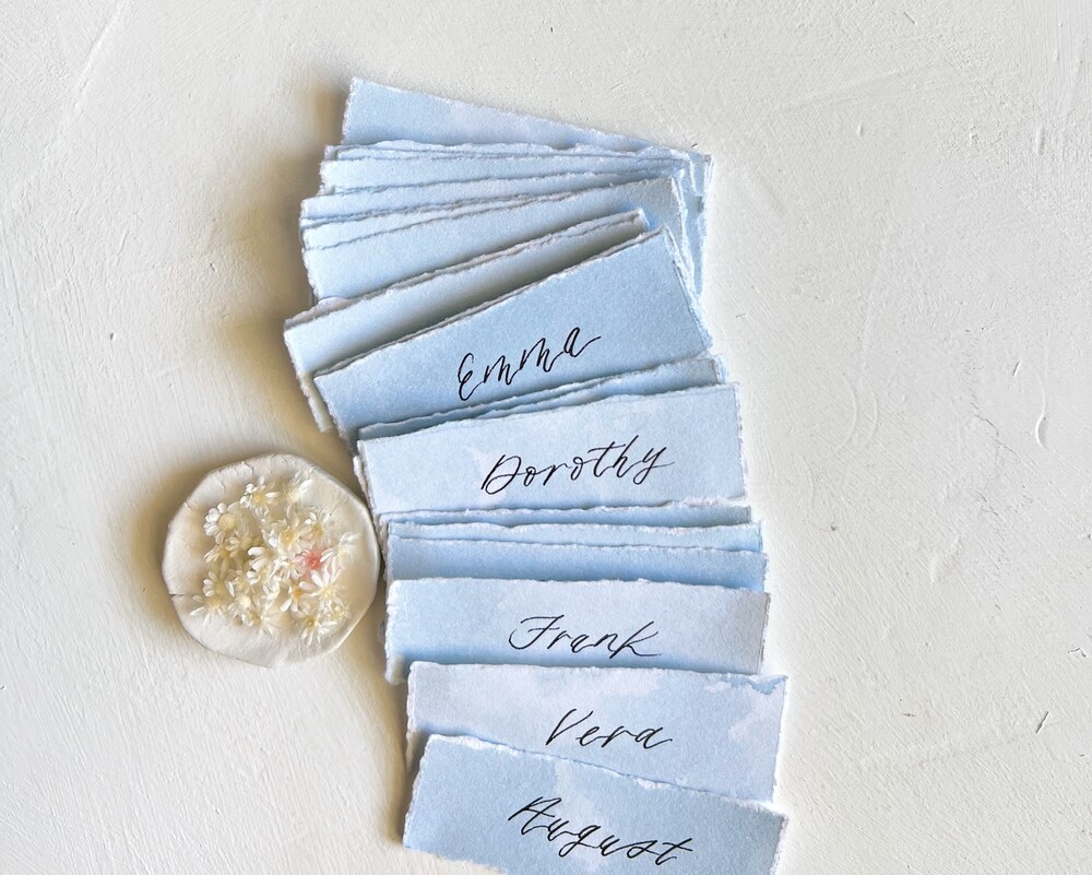 These beautiful wedding place cards feature hand-torn deckled edges and luxurious cotton texture, individually hand-dyed in natural indigo solution with elegant black calligraphy. Made from 100% tree-free, bleach-free cotton paper, they can also serve as escort cards with table numbers added upon request. You’ll enjoy the artisanal craftsmanship and eco-conscious materials that add sophisticated charm to your reception tables.