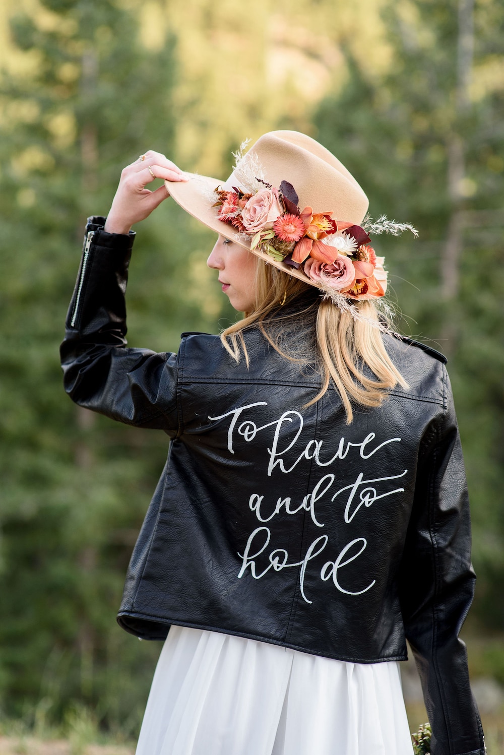 This hand-painted detailing transforms classic outerwear into a personalized bridal piece with custom calligraphy. The design can incorporate floral or geometric details to match your wedding aesthetic. It’s suitable for various wedding events, from elopements to receptions, offering versatility beyond the big day. The jacket is not included in this listing. You will need to provide your personal jacket (leather, faux leather, denim all work well)!