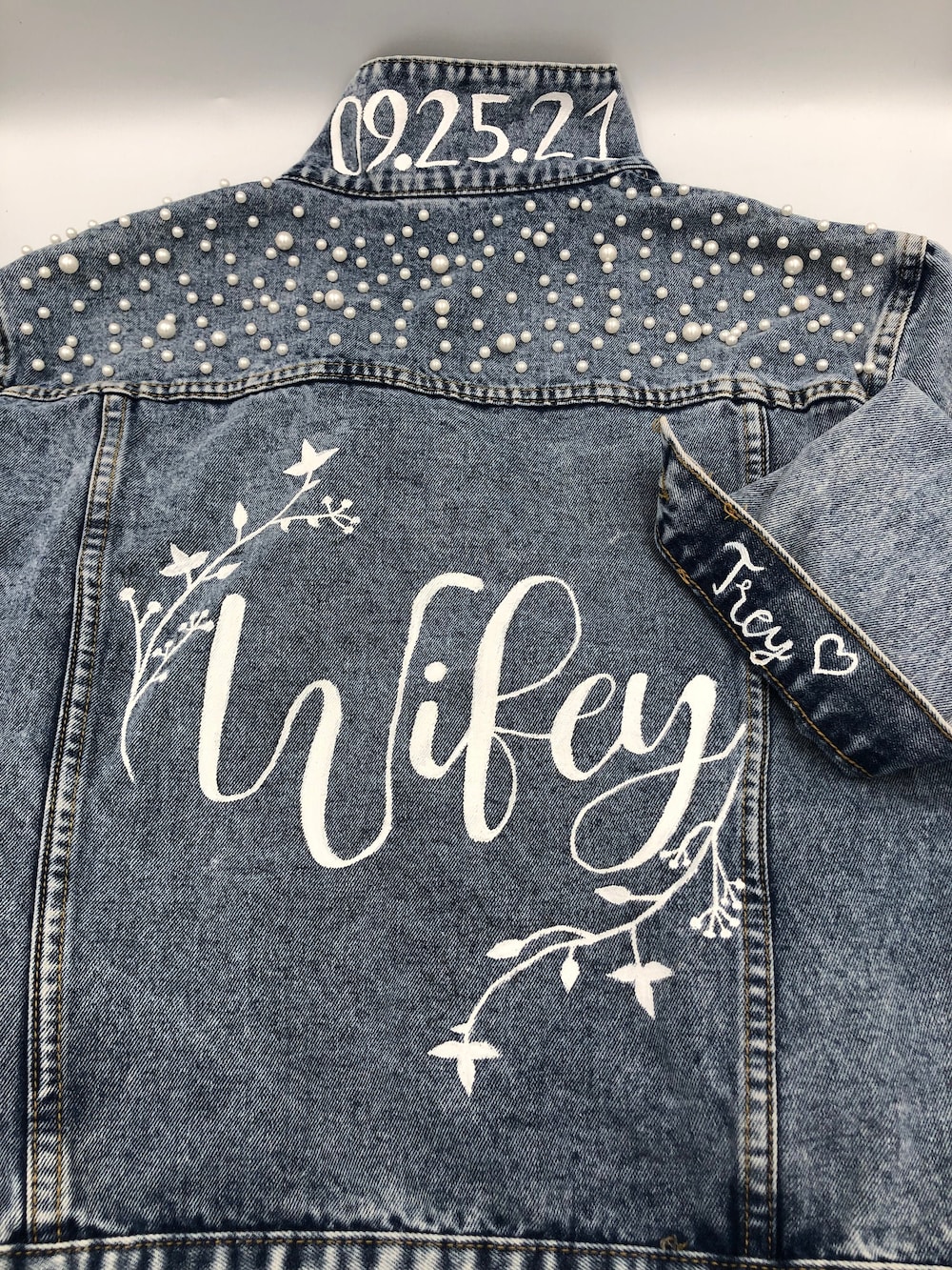 This hand-painted denim jacket features pearl embellishments for a stunning bridal look. The design includes personalization options for the back, collar and sleeve cuff, allowing for meaningful details to be added. Each jacket is custom-created to match your specifications, ensuring a unique piece for your special wedding celebration.
