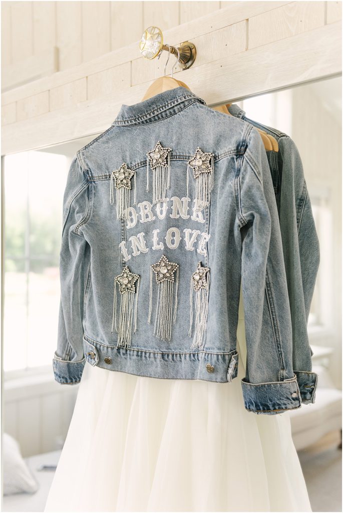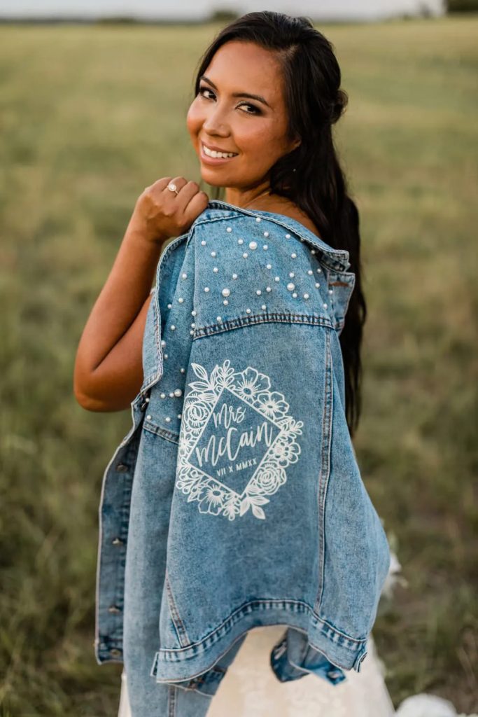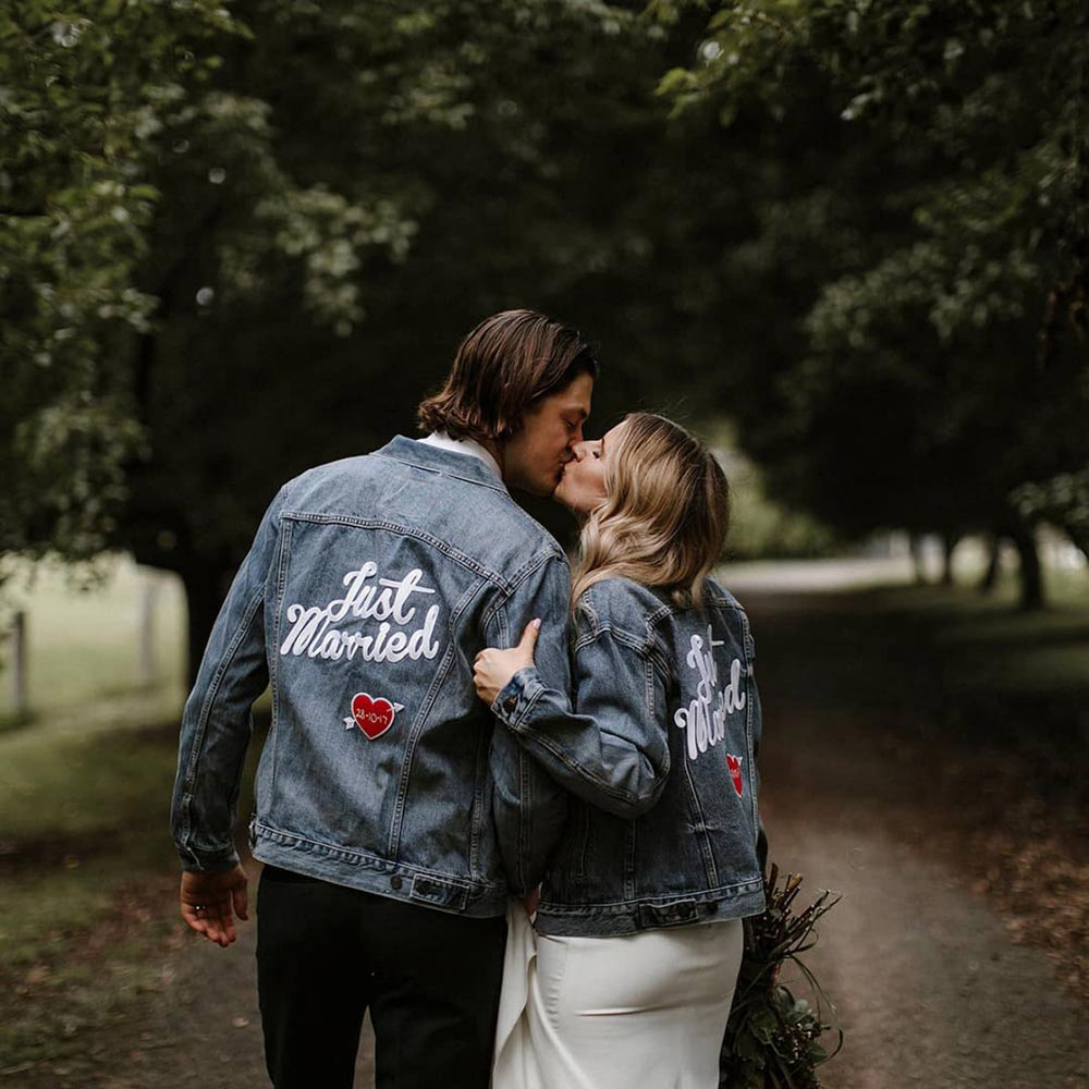 For a laid-back wedding vibe, you can’t go wrong with a jean jacket. Denim gives off that effortlessly cool, casual feel that’s perfect for down-to-earth celebrations. Whether you’re having a picturesque outdoor ceremony or a relaxed barn reception, a personalised jean jacket lets you make a stylish yet comfortable statement.