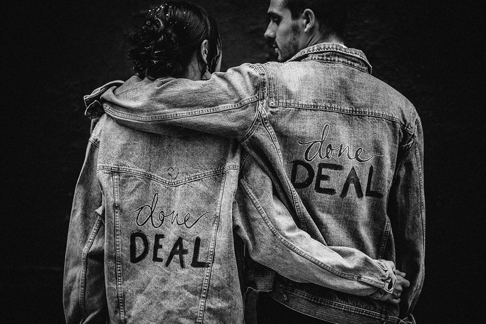 Ordering your custom wedding jacket early gives you plenty of chances to show it off. How fun would it be to kick things off with a “how it started vs how it’s going” moment during your engagement photo session?
