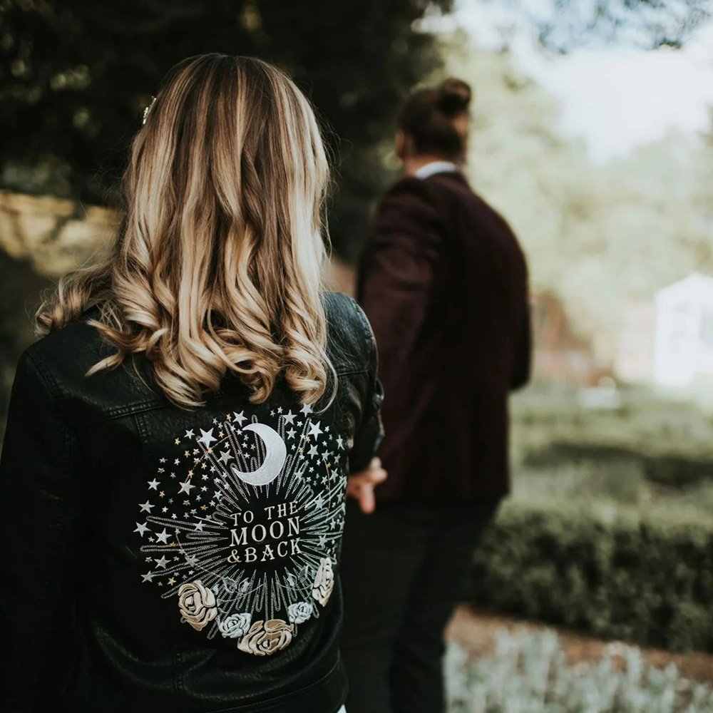 The back panel of your jacket makes the perfect blank canvas for larger scale art. Have a meaningful motif or phrase handpainted, stitched or transferred onto the fabric. Imagine those loved-up portraits of you embracing one another at the ceremony, enjoying a private moment walking hand-in-hand or sharing a laugh together during the reception with your custom design on full display!
