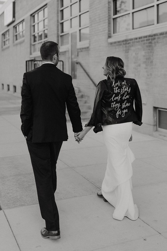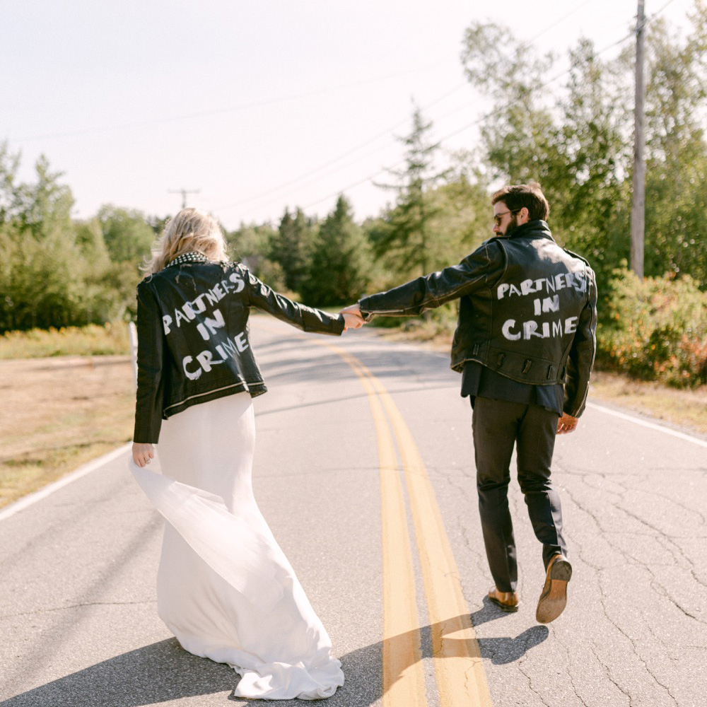 You’ll definitely want to keep wearing your jacket for your grand exit as you make your newlywed getaway! Slip it back on as you depart for one last photo moment before driving off into the night. It’s the ultimate “we’re outta here!” statement piece to end your big day.