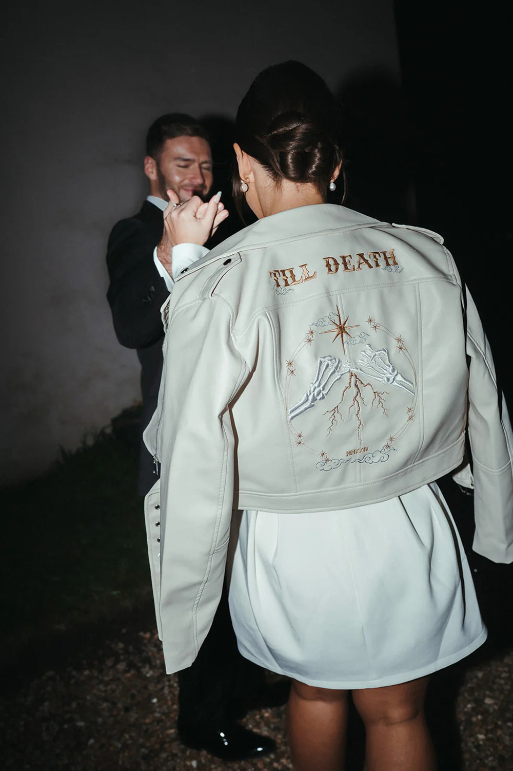 “Till Death” Embroidered Ivory Vegan Leather Crop Bridal Jacket with Skeleton Pinky Promise