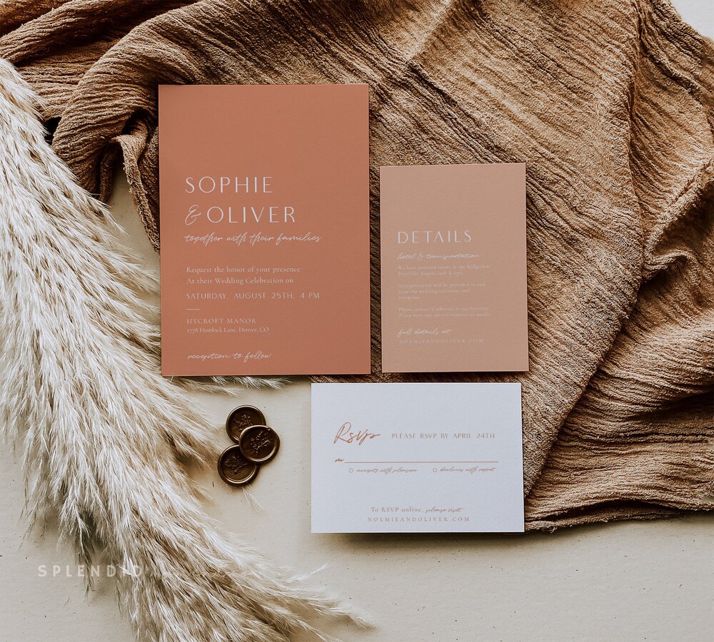 This wedding invitation suite template features a mix of modern fonts highlighting romantic bold colors that you can change to match your event. With the option to change the font, font color and background color on your invitation cards there’s the opportunity to make them truly your own for your wedding. Sized for US/CA/AU/EU.