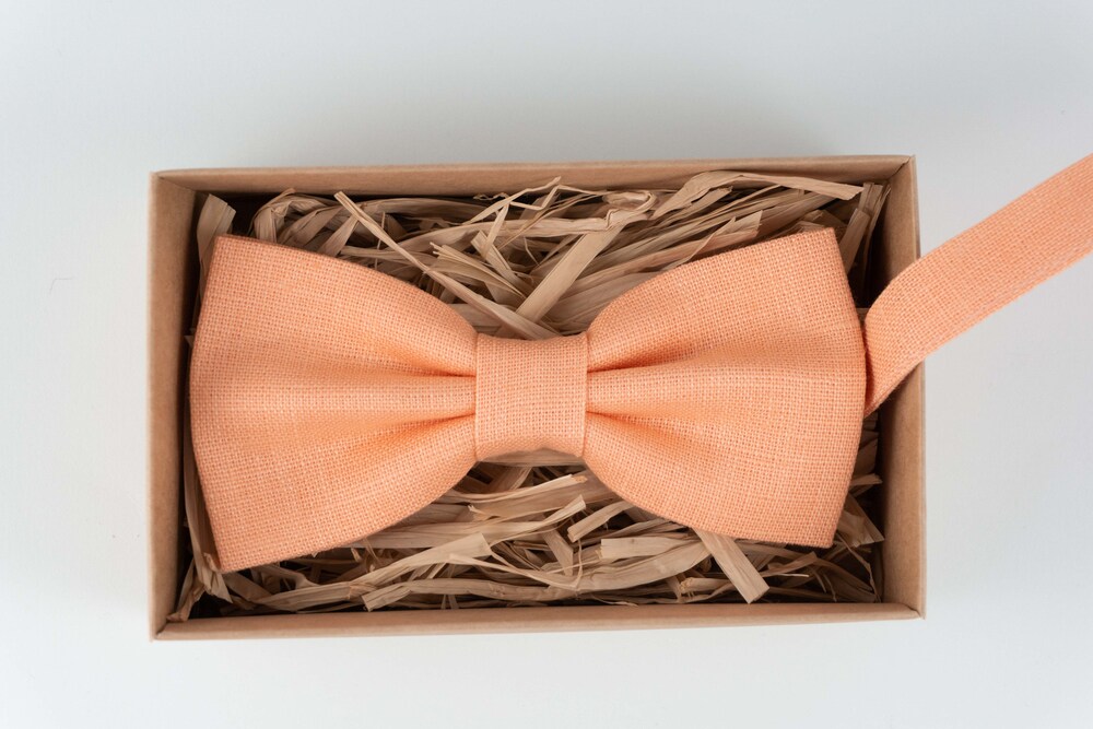 This peachy orange wedding bow tie can be made for adults, children or babies. They are made from organic linen and come packaged in a gift box. Please note that colors can vary from originals depending on computer monitor settings.