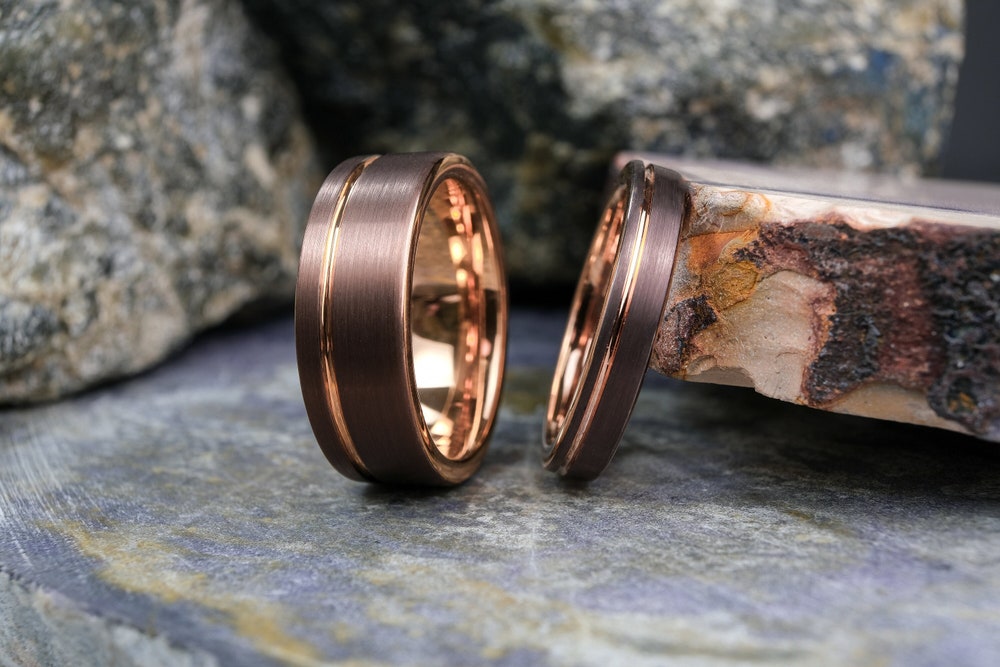 Matching Wedding Ring Set in Brushed Mocha Brown Tungsten with Rose Gold Stripe