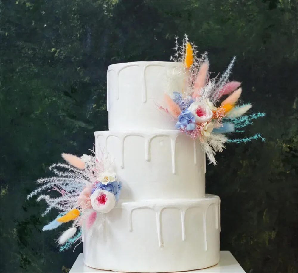 This beautiful two-piece cake decoration set combines artificial roses with pampas grass for a perfect pastel chic look. You’ll be able to enjoy these gorgeous accents before, during, and long after your special day as a lasting keepsake. Your cake photos will be absolutely stunning with these natural-looking decorations that add texture and romantic charm to your celebration.