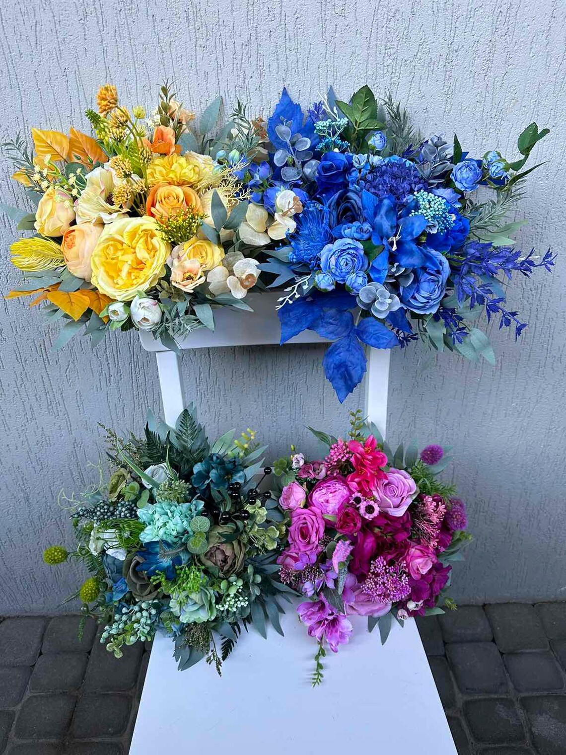 These vibrant rainbow silk faux flower bridesmaid bouquets are designed with your rainbow colored wedding in mind! In an array of lively hues that radiate joy and celebration to match your theme, each bouquet is crafted with assorted silk flowers in the block colours of the rainbow. Simply choose which bouquets suit your dresses, with custom orders accepted.