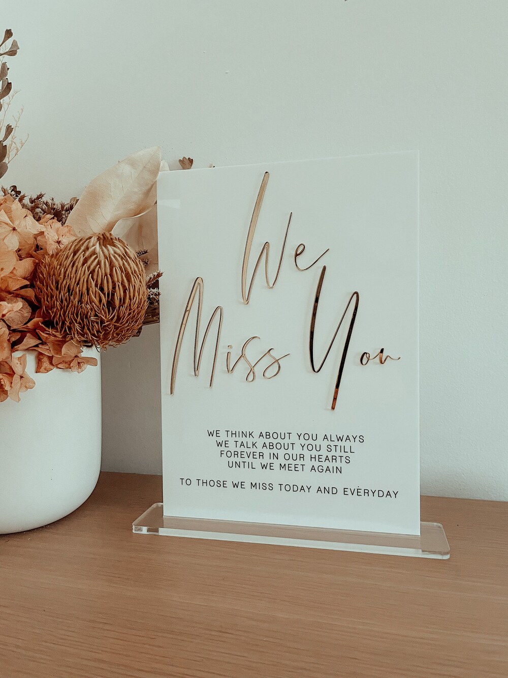 Pay tribute to loved ones who can’t be there on your wedding day with this handcrafted ‘We Miss You’ white acrylic sign, made to order with your choice of lettering colour. A clear base is included with purchase so you can display it anywhere.