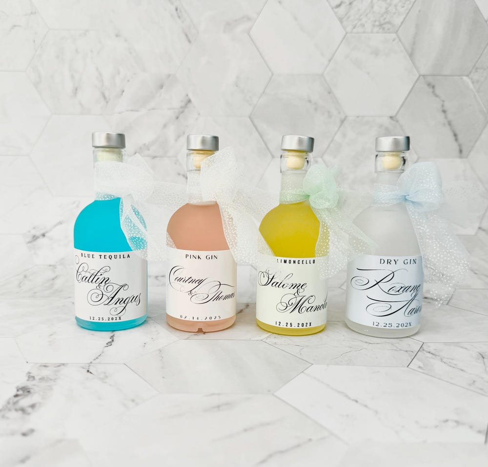 These sophisticated frosted glass shot bottles make the perfect bonbonniere that will add an elegant touch to your wedding celebration. Each bottle holds 60ml of liquid (about three shots) and comes with a secure aluminium lid, customisable labels in nine font options, and optional shimmery tulle bows. These high-quality, eco-friendly favours are sold ready to fill with your favourite mixer or liqueur, providing a stylish keepsake your guests will enjoy from your special day.