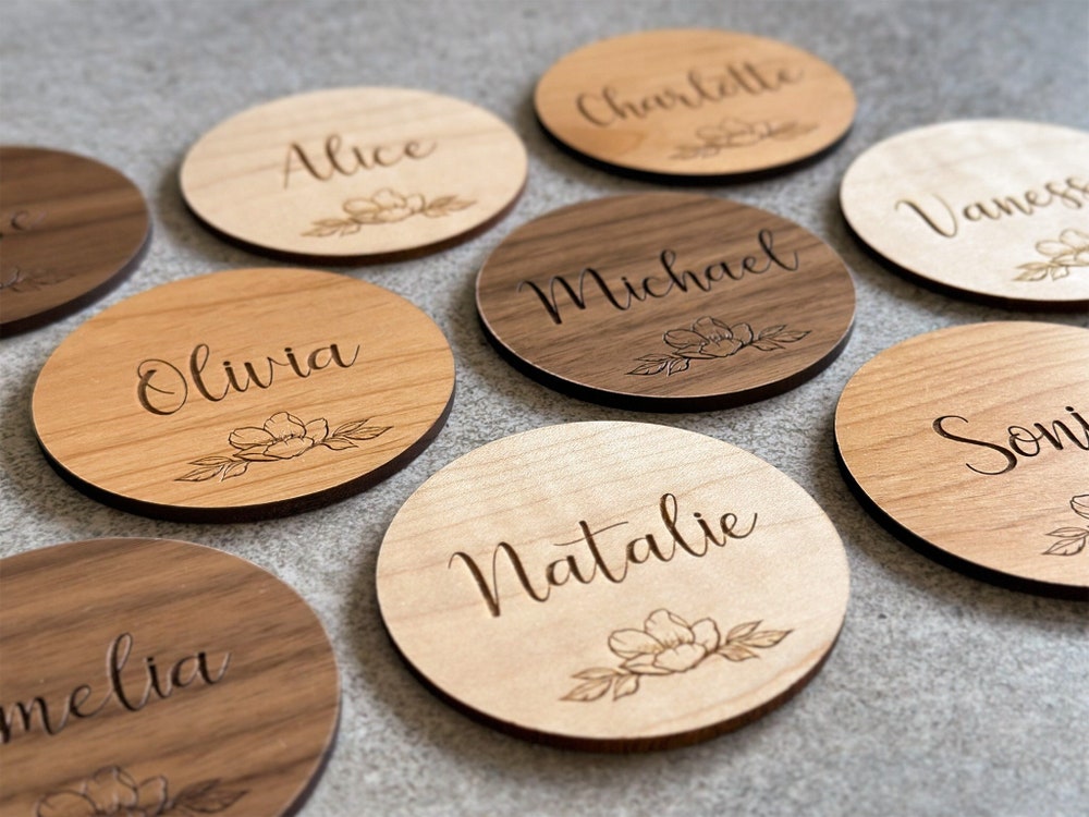 These ingenious solid wood engraved place cards double as drink coasters! This eco-friendly wedding favour is a perfect take home gift for your guests. Each one is crafted from a single piece of solid hardwood with a high-quality varnish finish on both sides, ensuring you’re giving a sustainable and truly unique gift. Available in various diameters from 7.6cm to 10.2cm and wood types including Maple, Alder and Walnut, these elegant personalised mementos serve as both functional table settings and cherished keepsakes of your special day.