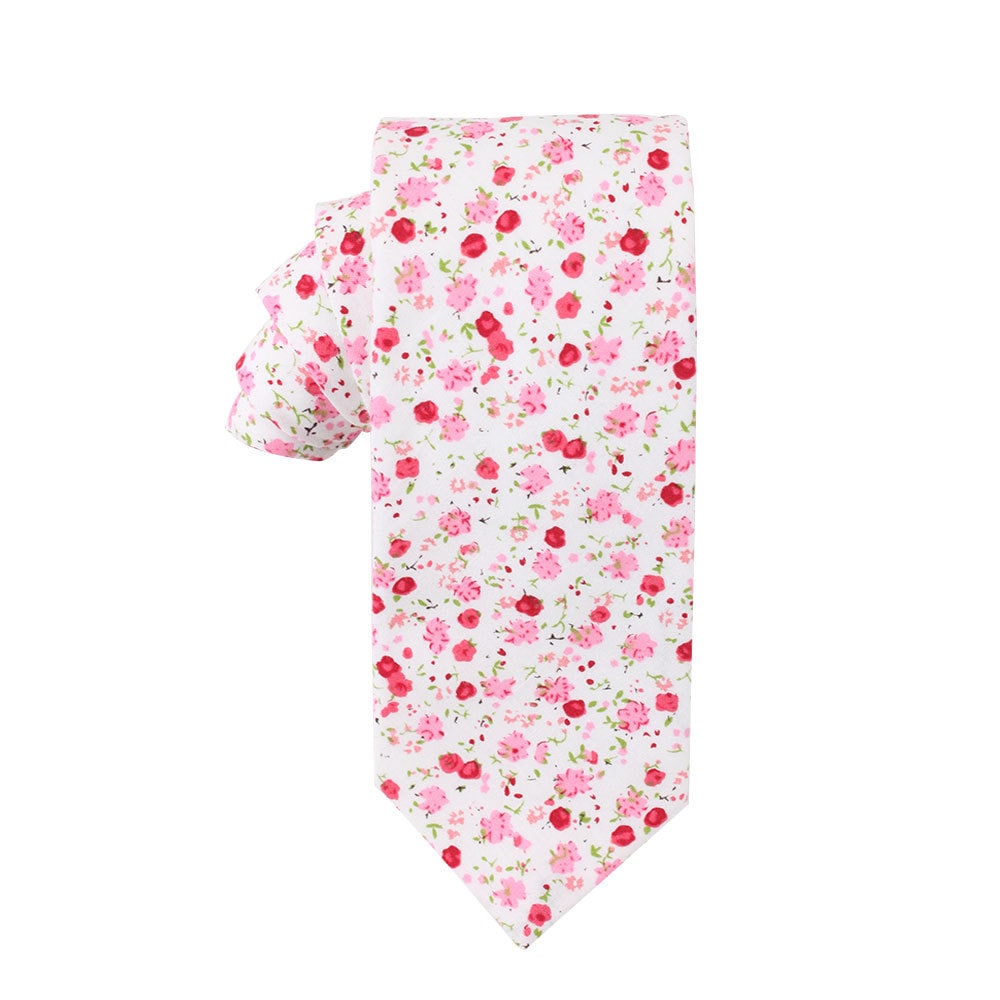 Handmade from 100% cotton, this whimsical ditsy floral skinny tie will set you apart, with different shades of light and dark pinks combined with a brilliant red and hints of green on a white background. Perfect for a spring wedding or garden party theme!