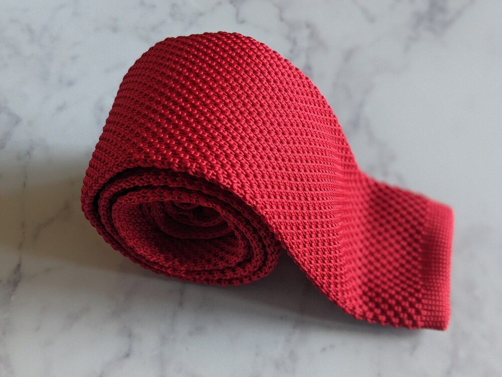 Add luxurious texture to your wedding day suiting with this handmade red knitted tie.