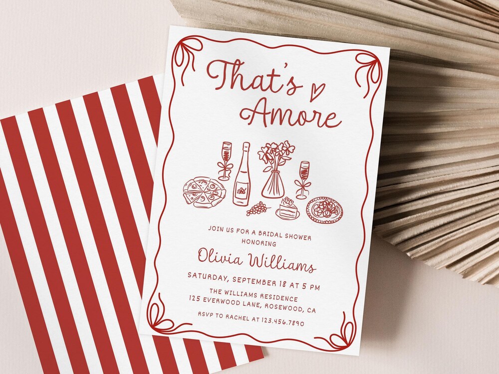 “That’s Amore” Bridal Shower Invitation Digital Download, with Hand Drawn Italian Pizza Pasta Dinner Theme, Wavy Bow Border