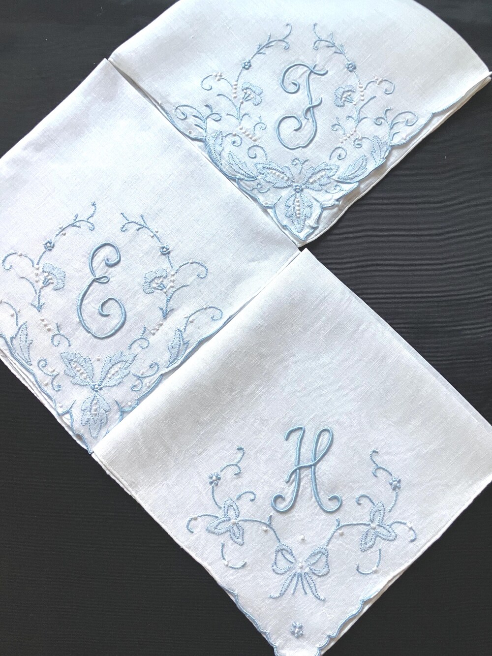 “Something Blue Before I Do” Vintage-Look Embroidered Initial Handkerchief: Bridal Shower Gift for Bride