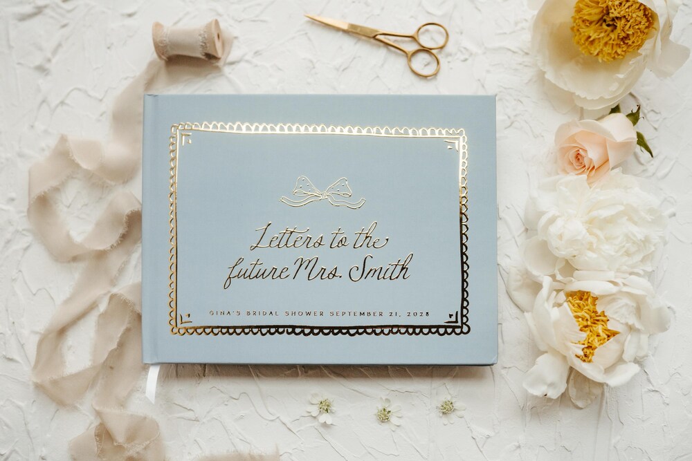 This charming “Letters to the Future Mrs [Name].” guestbook features an elegant powder blue cover with delicate gold metallic foil lettering and dainty bow illustration.The high-quality craftsmanship includes scalloped border details and complete personalization options available in a wide range of colors. Your bride will have a treasured keepsake filled with heartfelt messages and wisdom from loved ones that she’ll cherish forever.