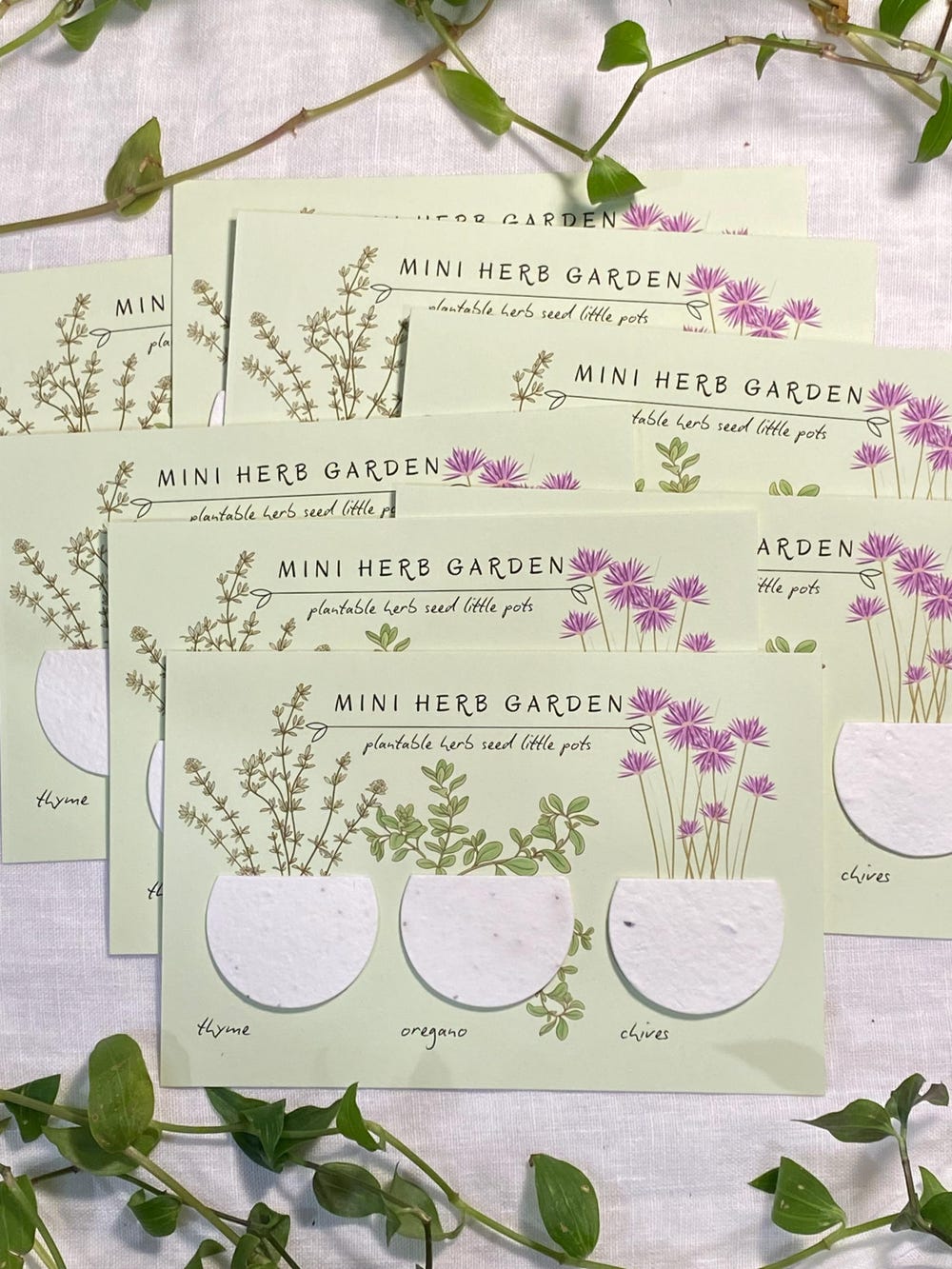 This sweet and environmentally friendly bridal shower favor features three plantable seed “pots” made from recycled paper and infused with non-GMO herb seeds including thyme, oregano, and chives. Printed on sustainable cotton paper with planting instructions on the back, each card includes space for a personal message and comes with a recycled envelope option. Your guests will love watching their herbs grow at home, creating a lasting memory of your special celebration that keeps giving long after the party ends.