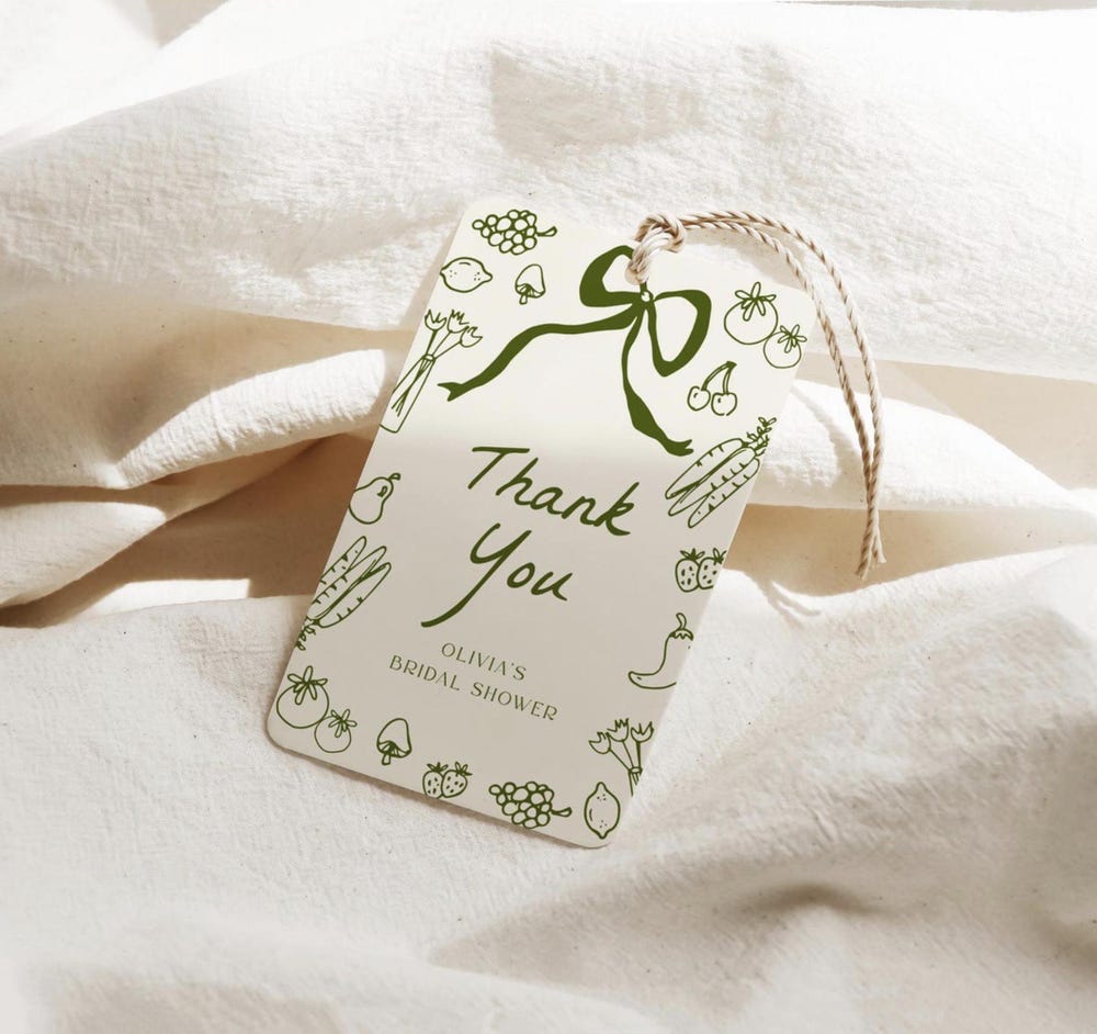 Farmers Market Themed Bridal Shower Favor Tag “Thankyou” Editable Template: Hand Drawn Bow, Fruits, Vegetables