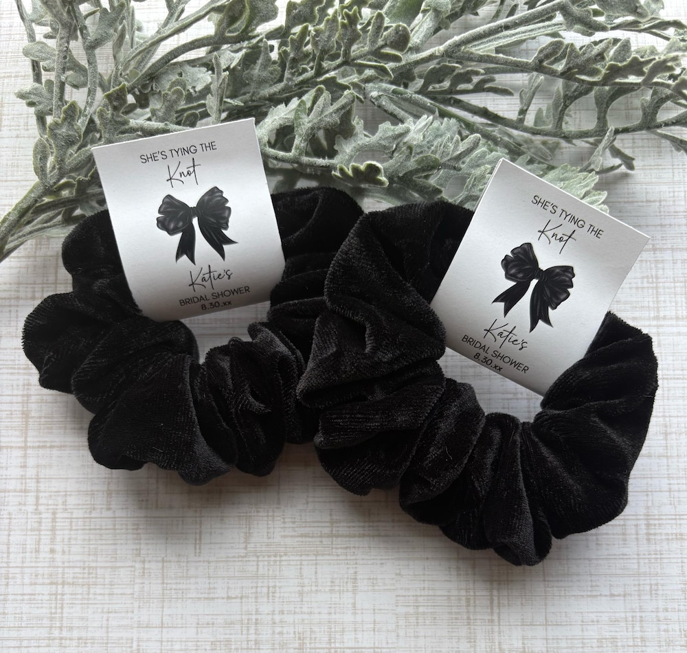 Personalized Black Scrunchie “She’s Tying the Knot” Bridal Shower, Velvet Hair Tie Favors