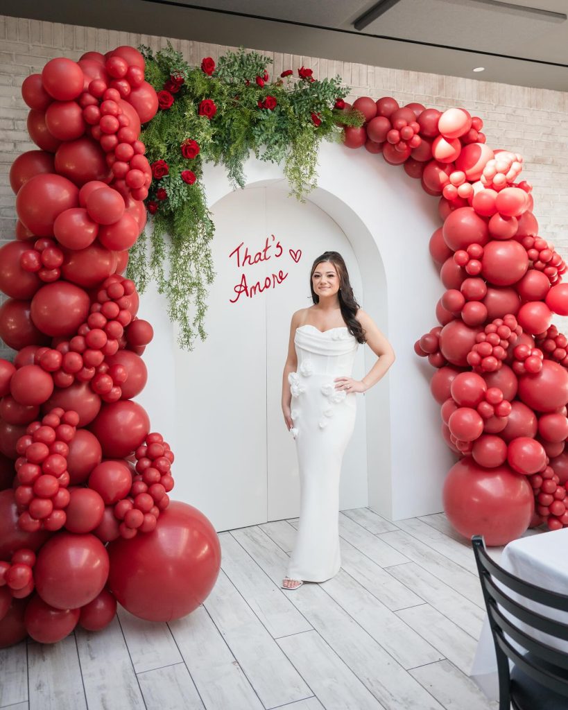 Create stunning Italian-inspired photo moments with a dramatic red balloon arch featuring cascading greenery and red roses, perfect for capturing that romantic “That’s Amore” feeling! Set up a charmingly simple Italian cafe backdrop using a white wall decorated with red script lettering, Italian phrases, and illustrated elements like pizza slices and wine bottles. For an authentic touch, hang wicker baskets filled with vibrant red geraniums and trailing ivy along walls or fences. You can create a rustic Italian villa feel with climbing greenery, wooden shutters, and vintage Italian signage for that perfect Tuscan countryside vibe.