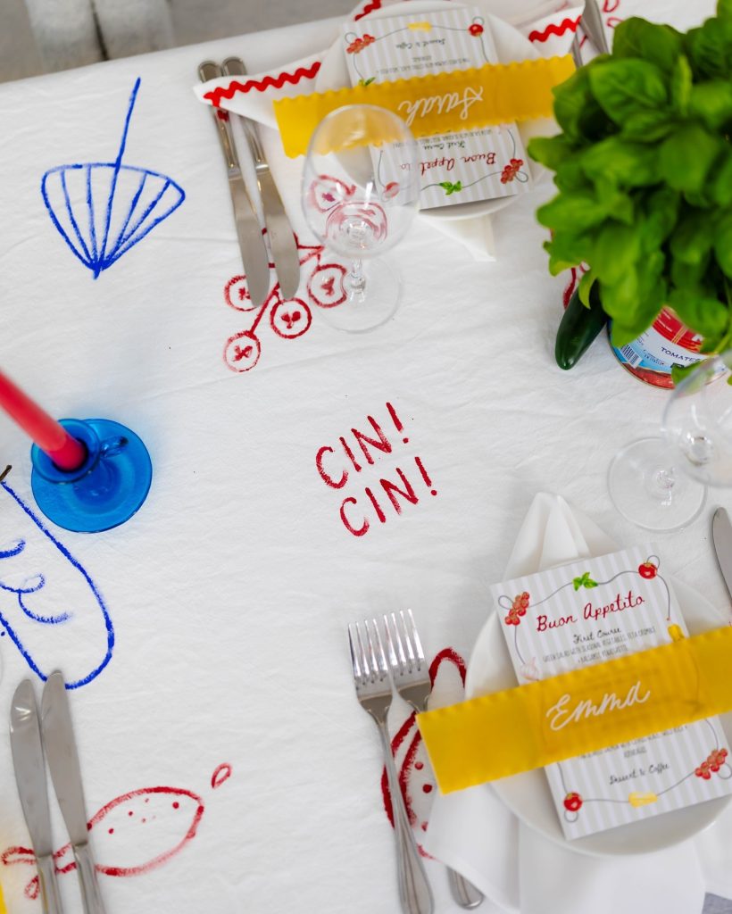 Take your tablescapes next level with personalized hand-drawn tablecloths featuring whimsical Italian dinner illustrations, complemented by custom cocktail napkins with the bride’s name and celebration date. Add charming pizza heart-shaped place cards for a playful touch, and include “That’s Amore” phrase centerpieces in floral arrangements. Complete the look with personalized champagne labels featuring classic Italian icons and custom stadium cups for toasting.