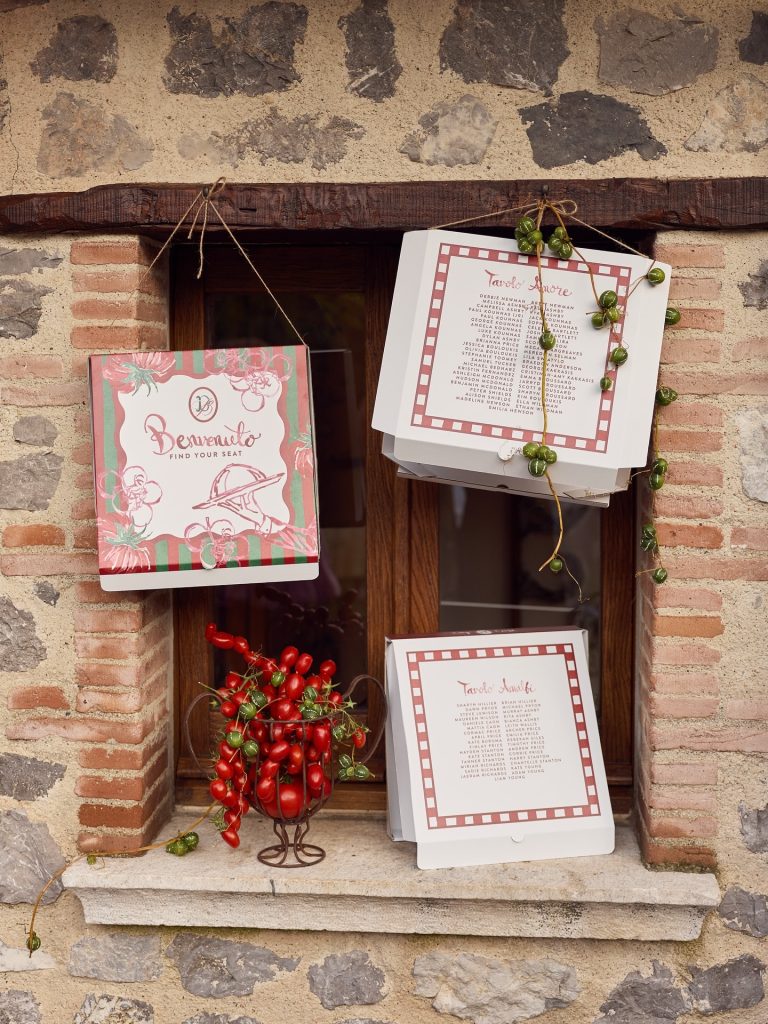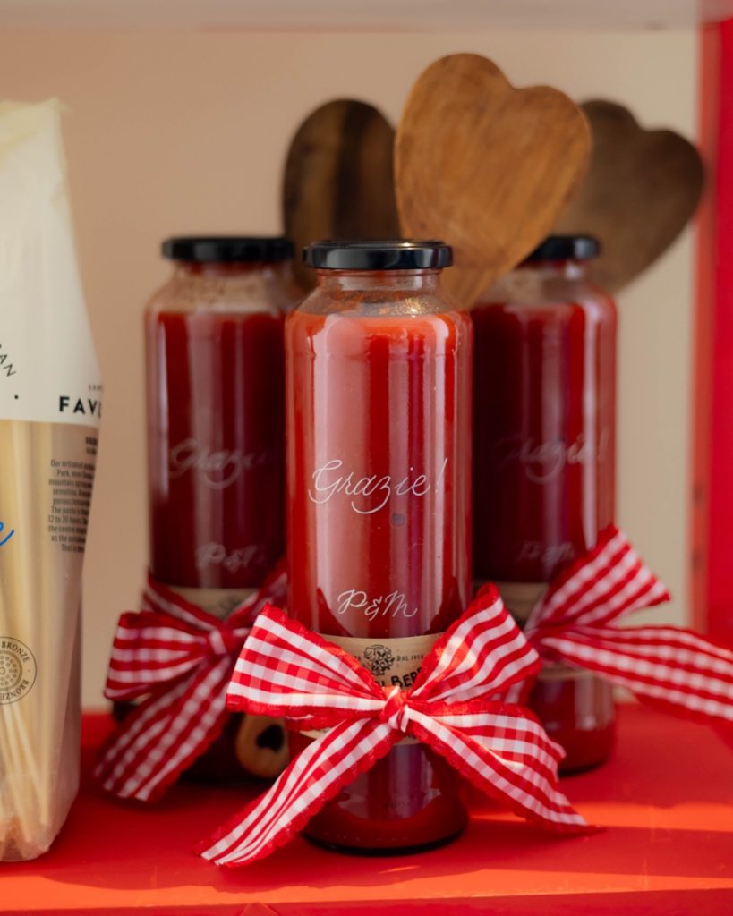 Complete your favor presentation with personalized muslin cotton favor bags or whimsical hand-drawn favor tags with Italian food illustrations. Add authentic Italian flair with “Grazie” thank you stickers or personalized, pizza slice-shaped gift tags.