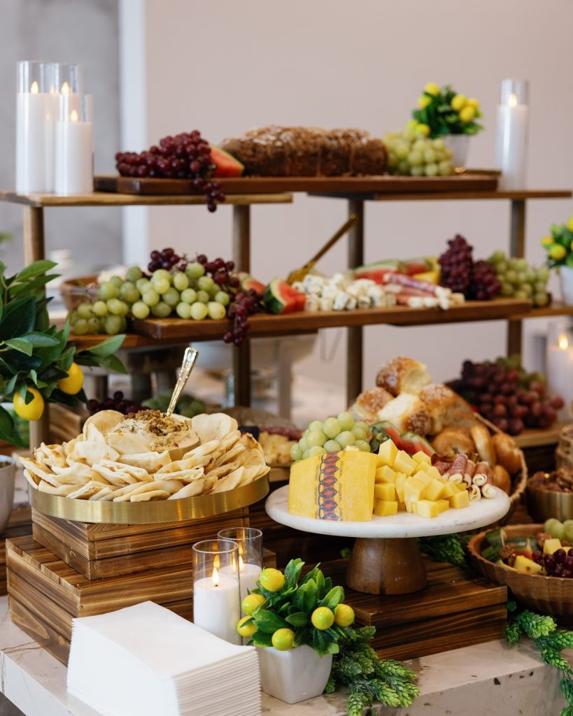 Build an impressive Italian antipasto display using tiered wooden stands filled with artisanal cheeses, cured meats, olives, and fresh mozzarella drizzled with olive oil.