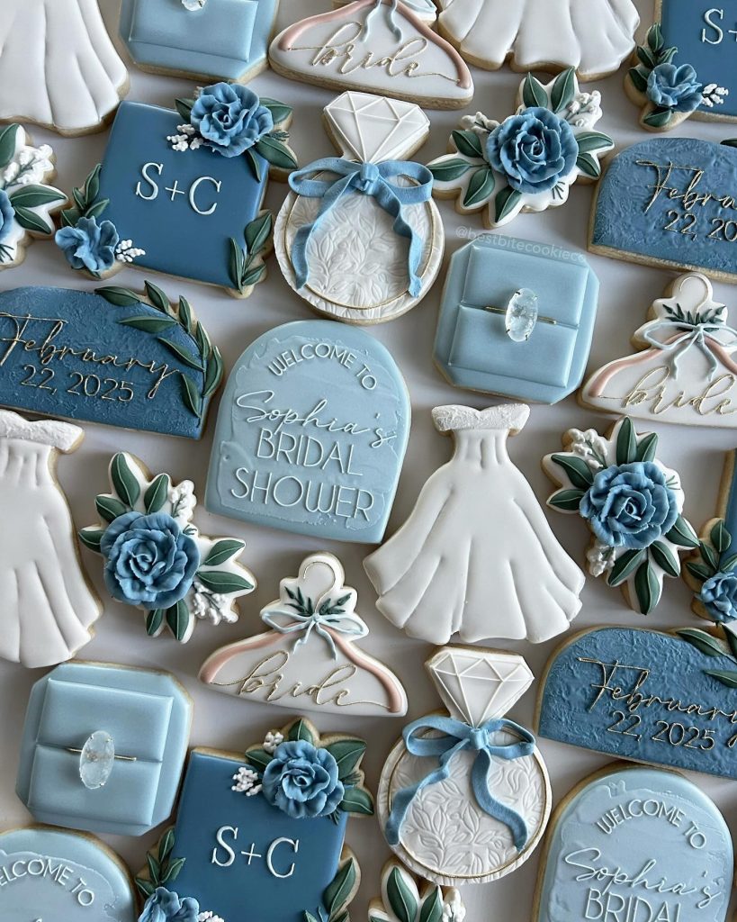 Guests sip champagne from crystal flutes, indulge in a breathtaking dessert display and custom cookies decorated with intricate blue motifs, play “Something Blue” themed games and take home keepsakes that match the event’s sophisticated tone.