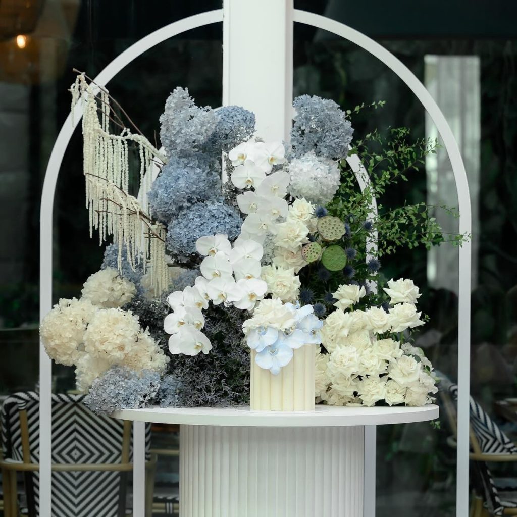 Dial your floral styling up a notch by adding lush arrangements featuring blue hydrangeas, white roses and greenery in crystal or white ceramic vases.