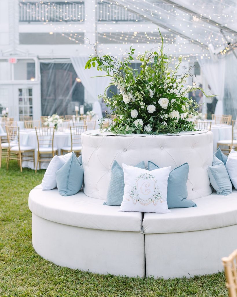 Create intimate seating areas with white chairs, ottomans and blue accent pillows, encouraging guests to relax, connect and have fun in sophisticated comfort.