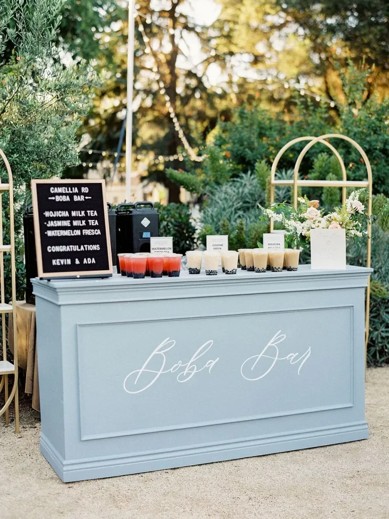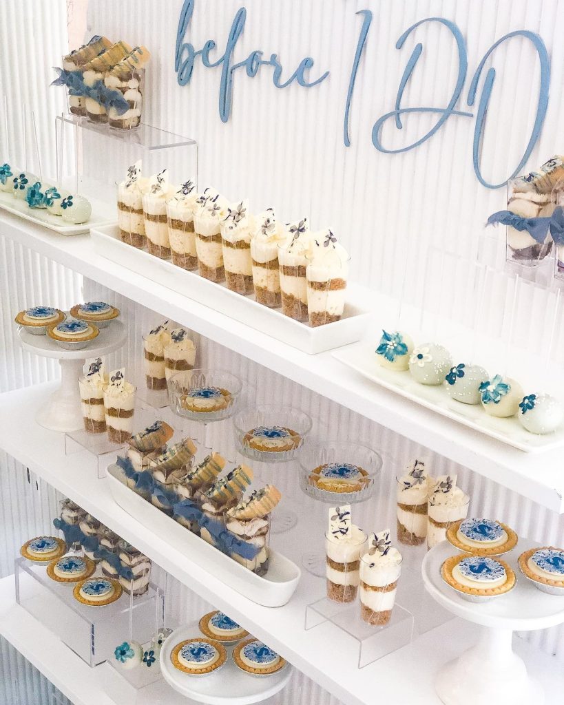 A beautifully styled drink station for this “Something Blue” themed bridal shower includes soft blue or white furniture pieces and is perfect for vintage-inspired crockery, plate and glassware. Create a sophisticated bar cart or rustic cabinet display in powder blue tones, complete with elegant glassware and botanical accents. Add custom cocktail napkins in coordinating blue and white accents and patterns, and for an extra thoughtful touch, personalized water bottle labels to complement the blue color scheme.